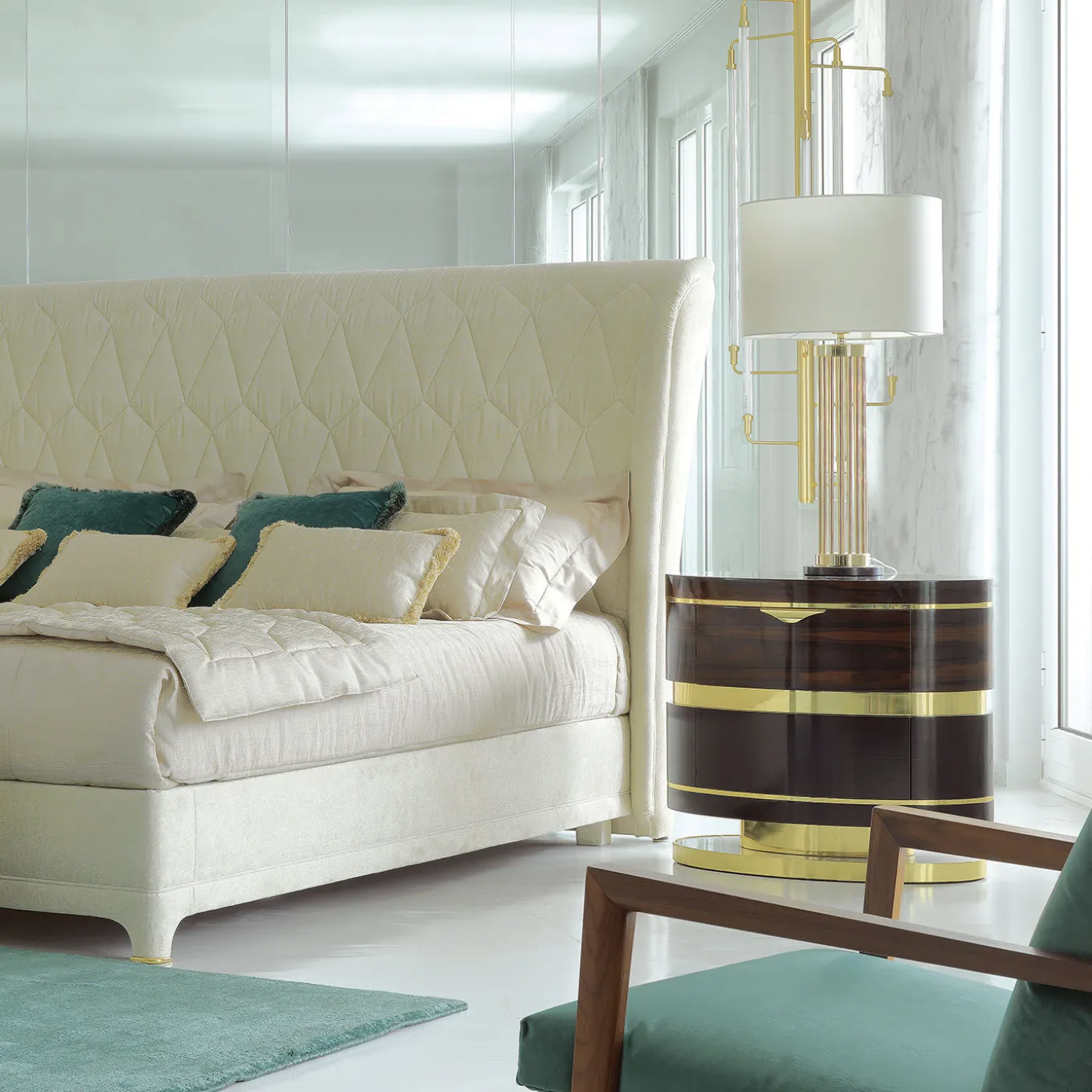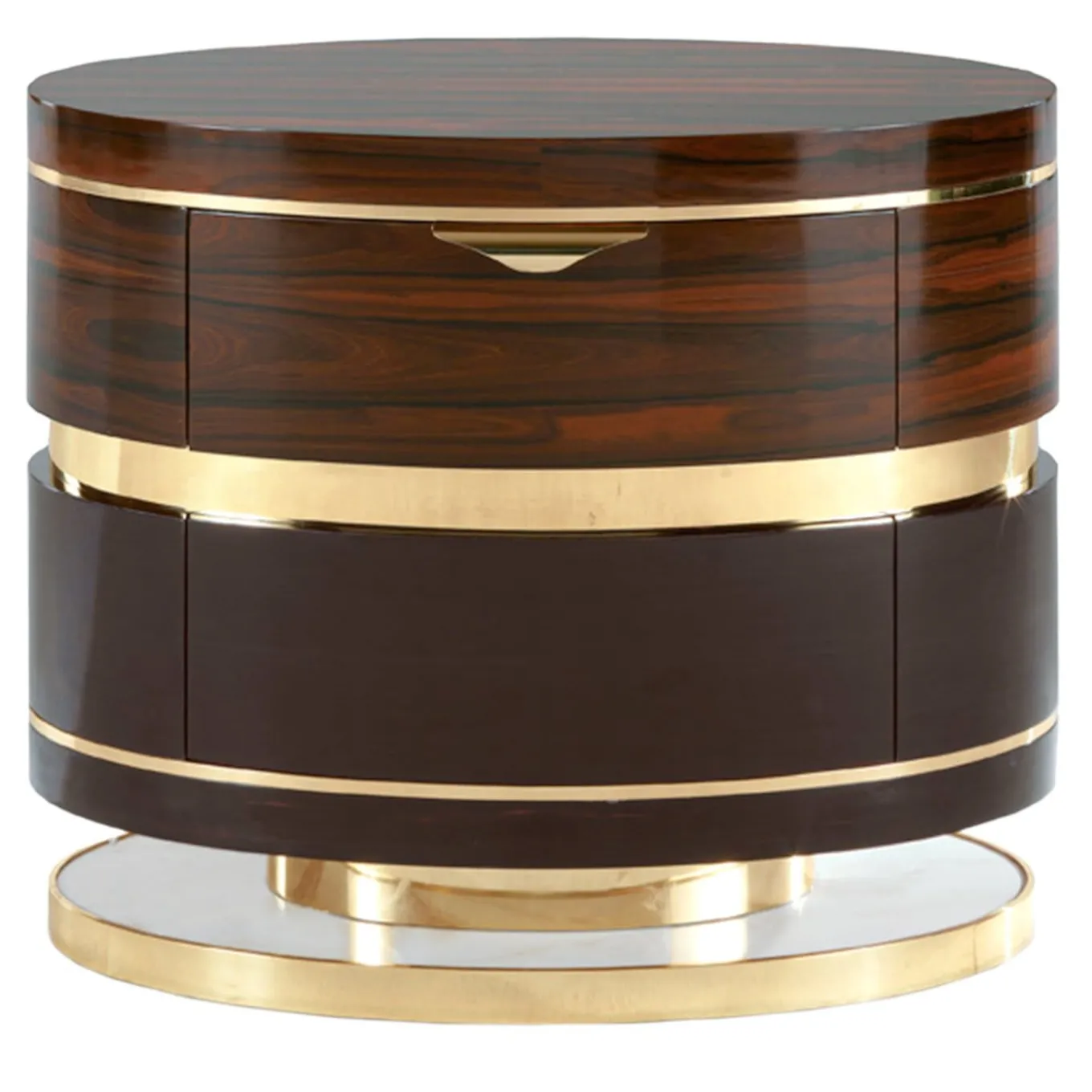 Combinando l’eleganza scura dell’ebano con le grandi venature del legno di ziricote, questo comodino ovale è uno straordinario pezzo di arredamento funzionale che arricchirà il look di qualsiasi camera da letto. L’audace struttura poggia su una base in ottone, che ricorre anche nei dettagli metallici e nella maniglia del cassetto. La base vanta inserti in marmo di Corteccia per un lussuoso effetto finale.