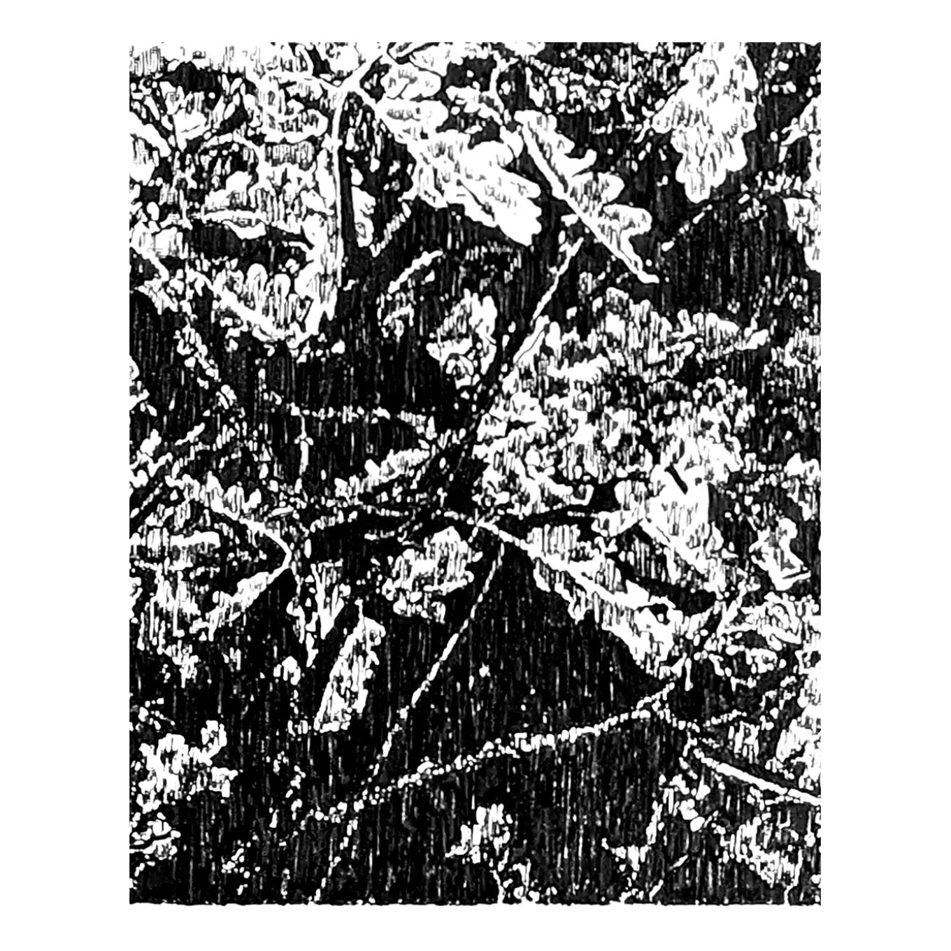 Realizzato durante un soggiorno in un mulino a vento nel sud-ovest della Francia, in un bosco di querce. Le foglie sono trattate come se fossero state fotografate di notte. Inchiostro su carta. Si tratta di un’opera unica. Cornice non inclusa.