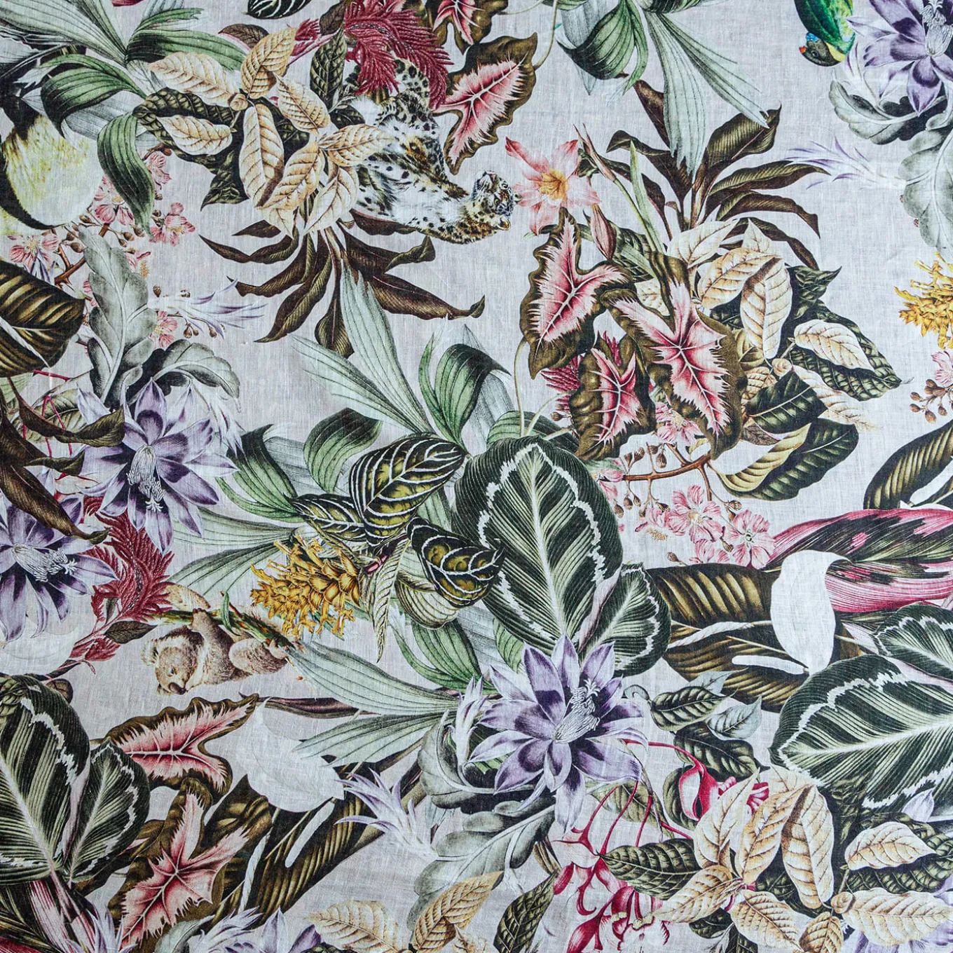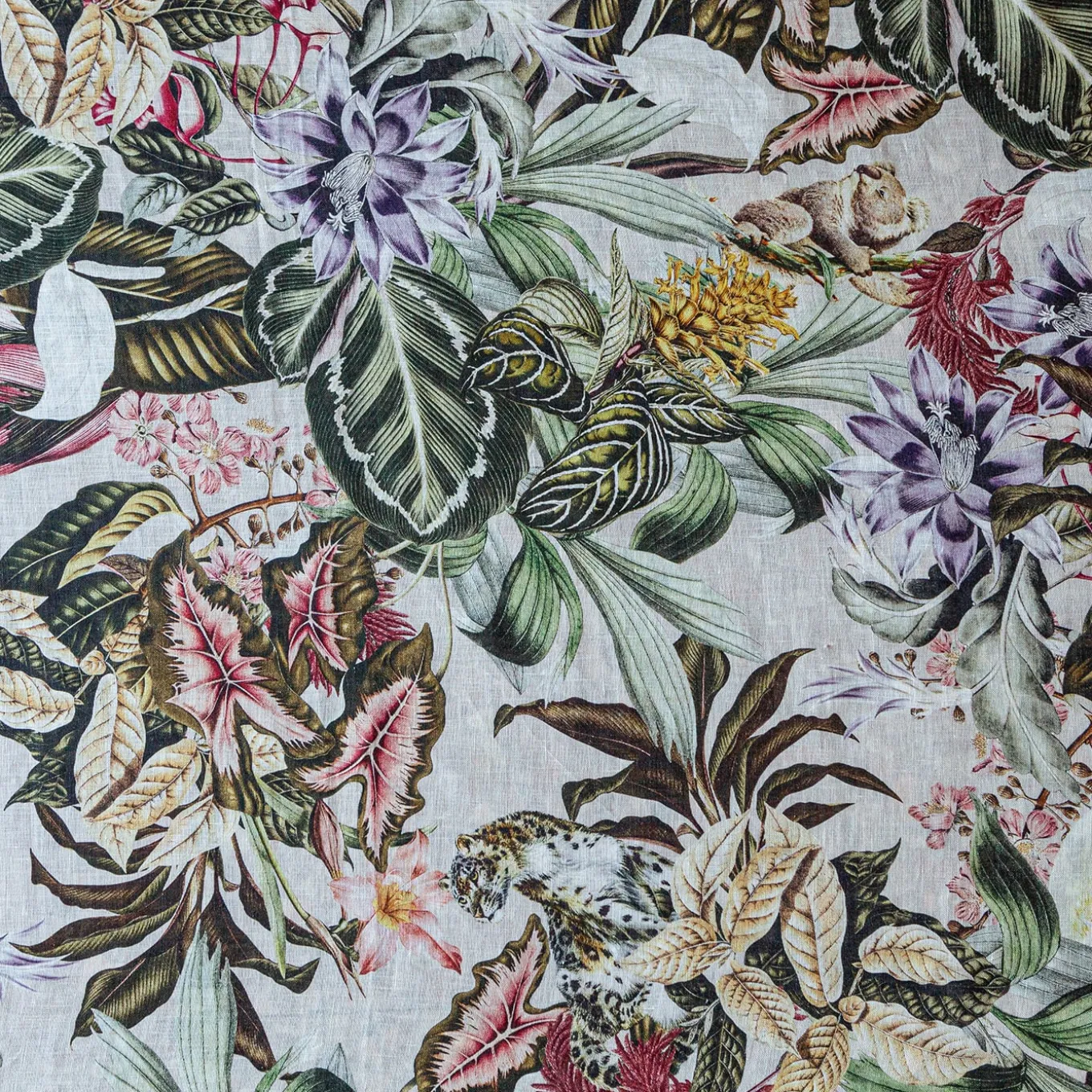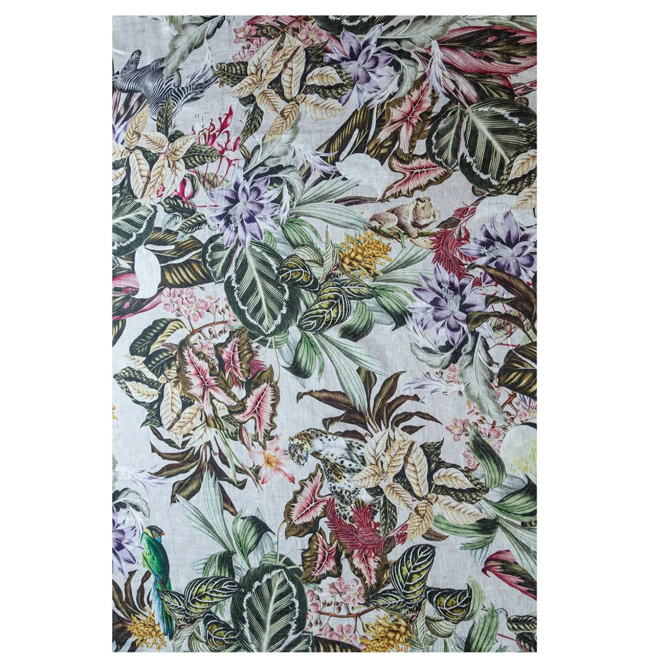 Ispirata al mondo degli animali esotici, questa tovaglia di lino è composta da un fitto intreccio di foglie e fiori tropicali da cui fanno capolino vari animali tra cui koala, giraffe e ghepardi. Un design unico e d’impatto, perfetto per ogni situazione. Disponibile in diverse dimensioni. Per ulteriori informazioni, rivolgersi al Concierge.
