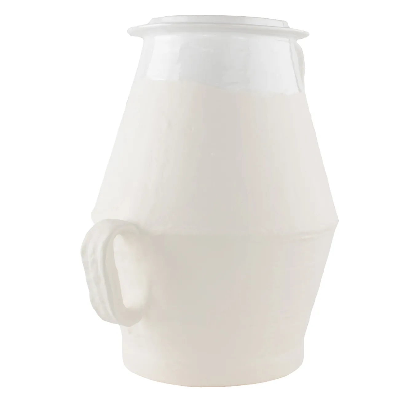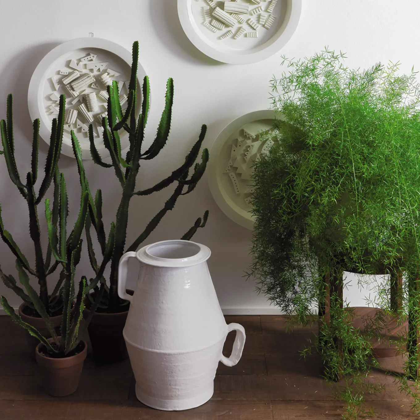 L’annaffiatoio Bianco Latte 06 in ceramica bianca reinterpreta i tradizionali contenitori di latte rurale con un design raffinato ed essenziale. L’esterno in ceramica biscuit grezzo contrasta con l’interno e il beccuccio smaltati di bianco, creando un dialogo tattile e visivo. Caratterizzata da manici asimmetrici e sporgenti, l’opera evoca gesti storici introducendo una forza scultorea. Progettata da Paola Navone per LANDO, questo pezzo trasforma un ricordo rurale in un artefatto contemporaneo poetico.