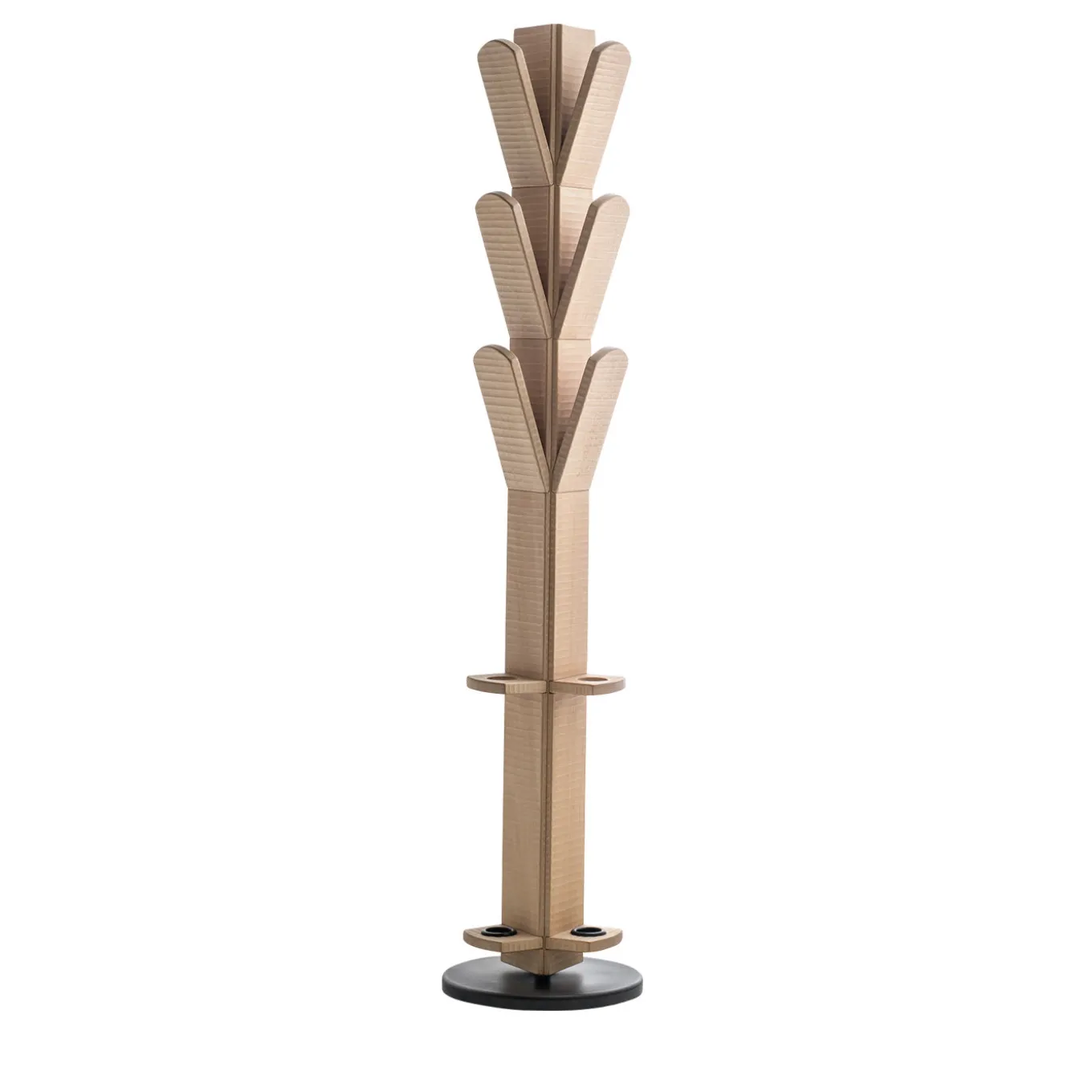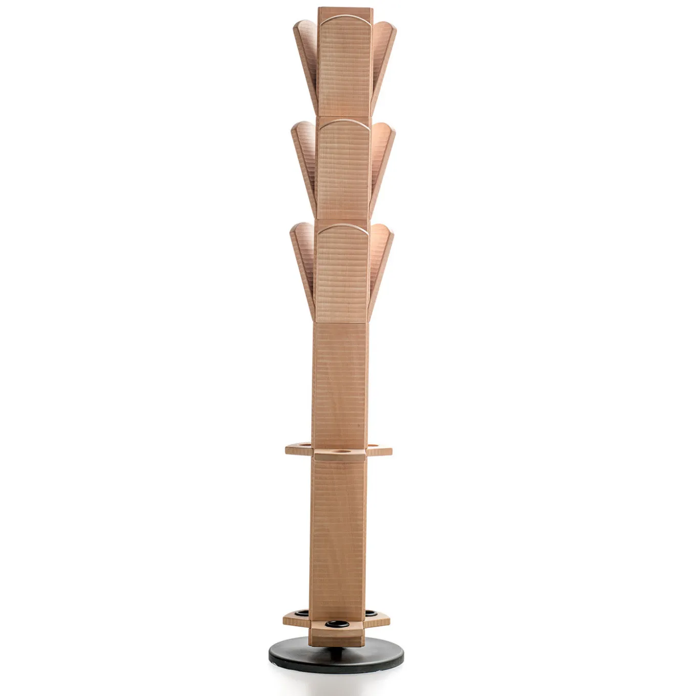Il corpo triangolare di questo sorprendente appendiabiti poggia su una base di metallo lucido. La parte centrale e quella superiore sono tagliate da nove inserti in legno, mentre la parte inferiore ospita tre fori per ombrelli. Il legno è noce chiaro italiano.