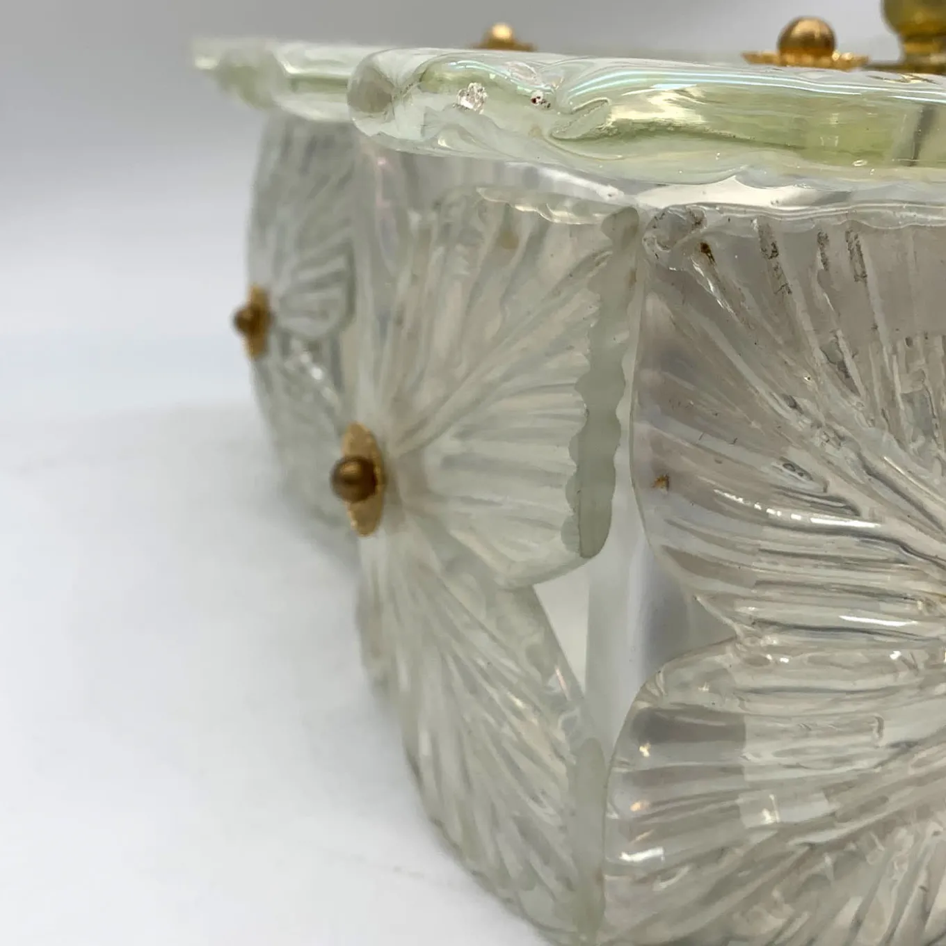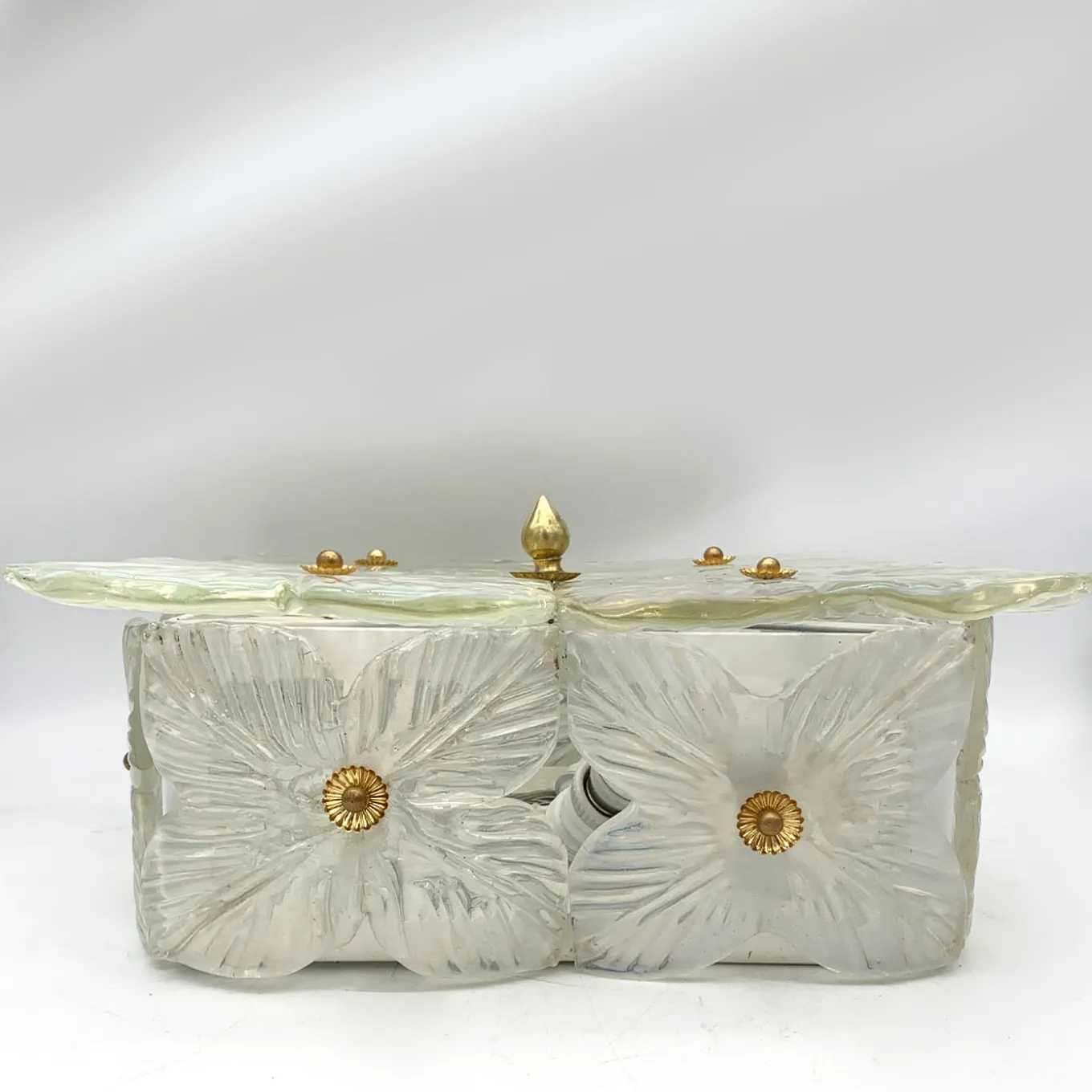 Questa squisita lampada da parete a forma di fiore di Murano presenta una straordinaria fusione di arte e illuminazione. Realizzata in vetro raro, la lampada presenta un accattivante disegno floreale che valorizza qualsiasi spazio. I petali in vetro trasparente e acidato emanano eleganza, rendendola non solo un apparecchio di illuminazione ma un potenziale pezzo da museo. Progettato per essere versatile, questo apparecchio può essere installato sia a soffitto che a parete, per adattarsi a diverse estetiche d’interni. È dotato di tre attacchi per lampadine E27, ideali per l’illuminazione a LED, che garantiscono funzionalità ed efficienza energetica. Gli originali accenti in ottone aggiungono un tocco di calore, armonizzandosi perfettamente con gli elementi in vetro.