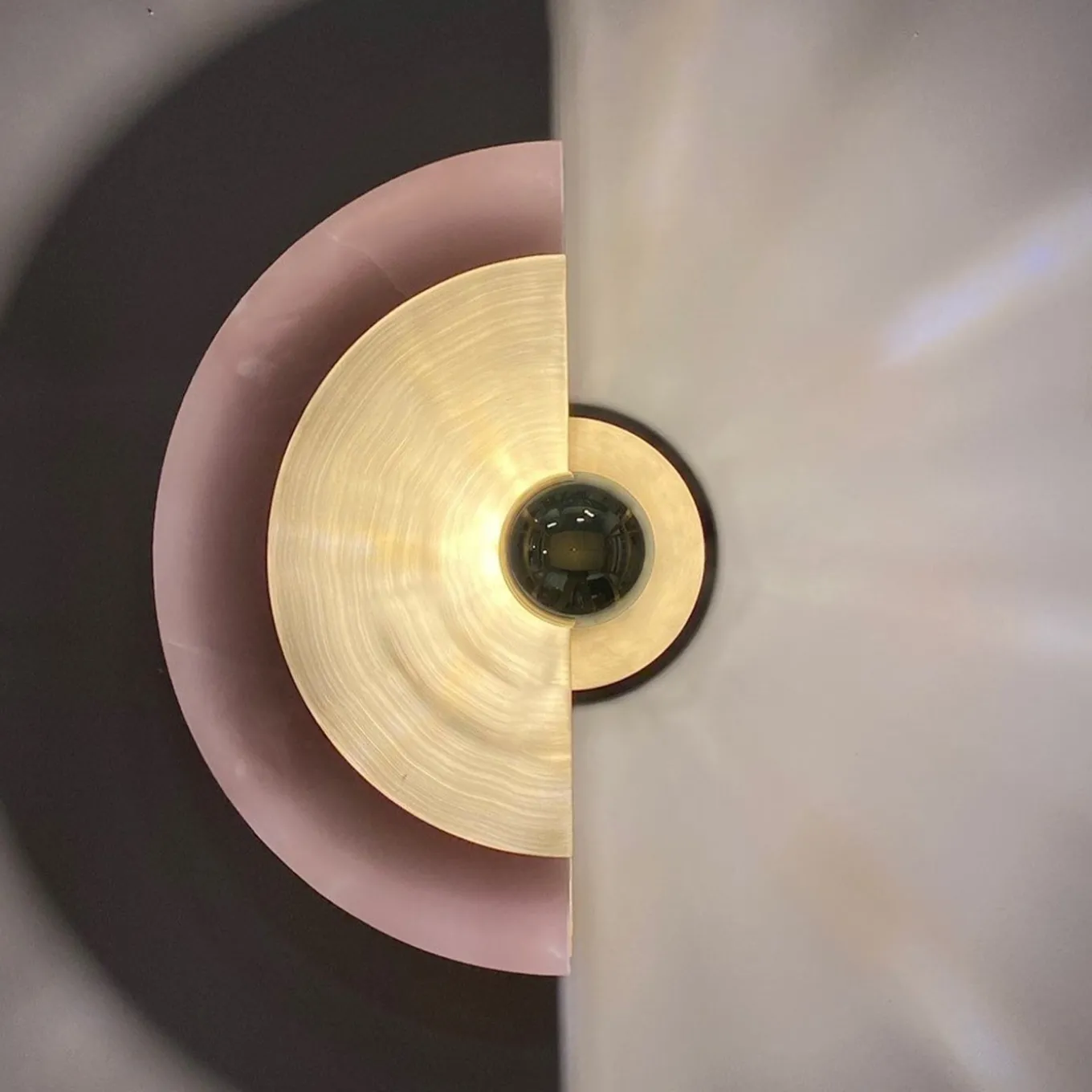 L’applique Levante, con la sua forma circolare, è un forte richiamo al sole. La possibilità di collocare i dischi in 12 posizioni diverse offre originali giochi di luci e ombre proiettati sulla parete. La struttura e il disco in ottone, abbinati all’altro disco in onice, sono illuminati da una lampadina con calotta dorata, che enfatizza i toni dei materiali e, allo stesso tempo, illumina la parete con colori caldi.