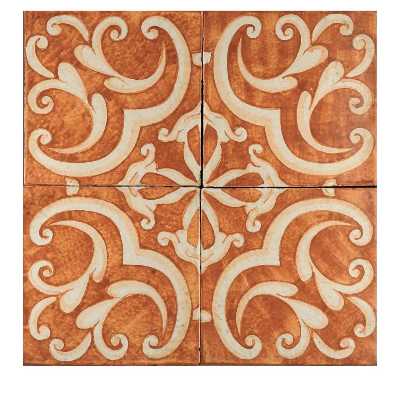 Abilmente realizzate a mano dai maestri artigiani dello Studio Le Nid, queste versatili maioliche catturano la ricca tradizione artistica e culturale della Sicilia. Una serie di quattro piastrelle rivela un design a specchio con eleganti volute in avorio che dominano i motivi centrali e angolari su uno sfondo arancione, che ricorda i motivi a forma di fleur de lis del Rinascimento. Queste piastrelle sono ideali come superficie o pannello in una cucina rustica, una sala da pranzo, un bagno o una veranda. Le piastrelle devono essere applicate con una stuccatura minima per creare un design senza soluzione di continuità.