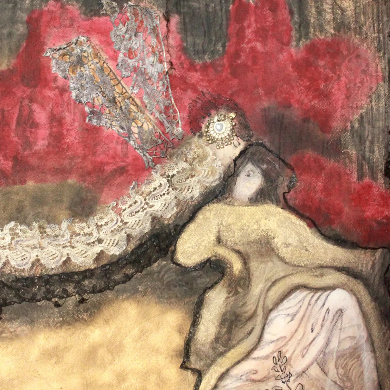 The Awaiting Tapestry reimmagina la tappezzeria antica, sovvertendo l’immaginario tradizionale della vita borghese con pittura a mano, passamanerie cucite, pizzi d’epoca, lamine metalliche, gioielli, perle e cristalli. Scene neutre e pastorali si trasformano in mondi audaci e fantastici: alberi di perle, uccelli ingioiellati, fiumi di catene e animali rivestiti di tessuto. Ogni dettaglio intricato invita a un’esplorazione più approfondita, riscrivendo la narrazione in una visione surreale e moderna. Questo pezzo è unico.