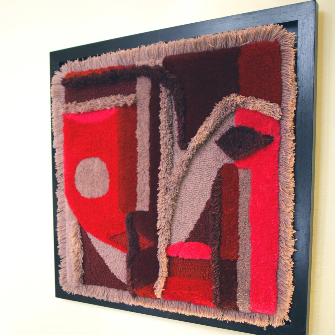 I disegni della serie di arazzi CAPOVOLTO si basano su una maschera con i tratti del viso umano che si riflettono al contrario. Un personaggio ha diversi stati d’animo e lati della sua personalità. Qual è quello che prevale? L’opera può anche essere appesa a testa in giù (in italiano si dice “capovolto”) facendo prevalere l’altro stato d’animo. I colori sono rosa acceso, rosso e bordeaux in una finitura tridimensionale. L’arazzo ha una cornice in legno nero. L’opera è numerata e firmata dall’artista.