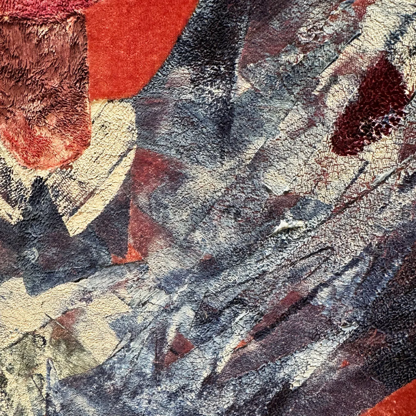 Questo vibrante arazzo presenta una base di seta vellutata tinta a mano nei toni del cremisi e del bordeaux, arricchita da paste colorate. Incorpora un elemento in vetro di Murano trasparente con foglia d’oro, creando effetti visivi dinamici che cambiano con la prospettiva e la luce. Montato su una robusta cornice di legno, il pezzo riflette le tradizioni veneziane attraverso dettagli meticolosi e tecniche innovative.