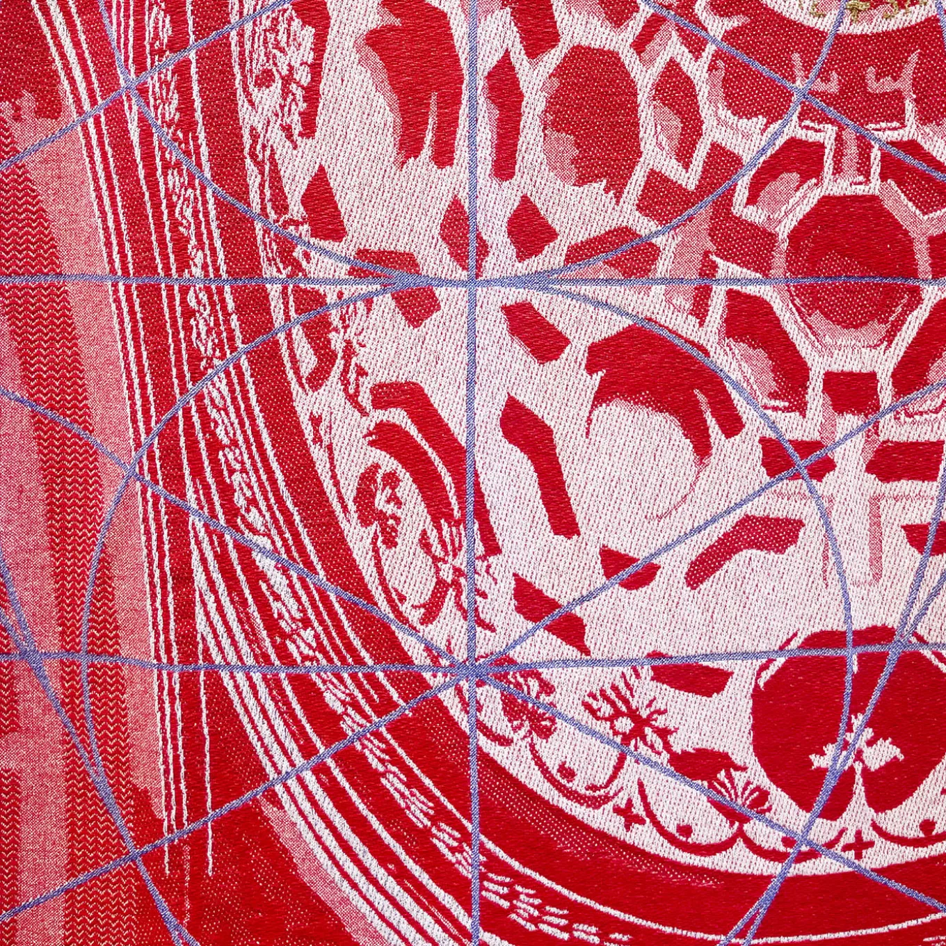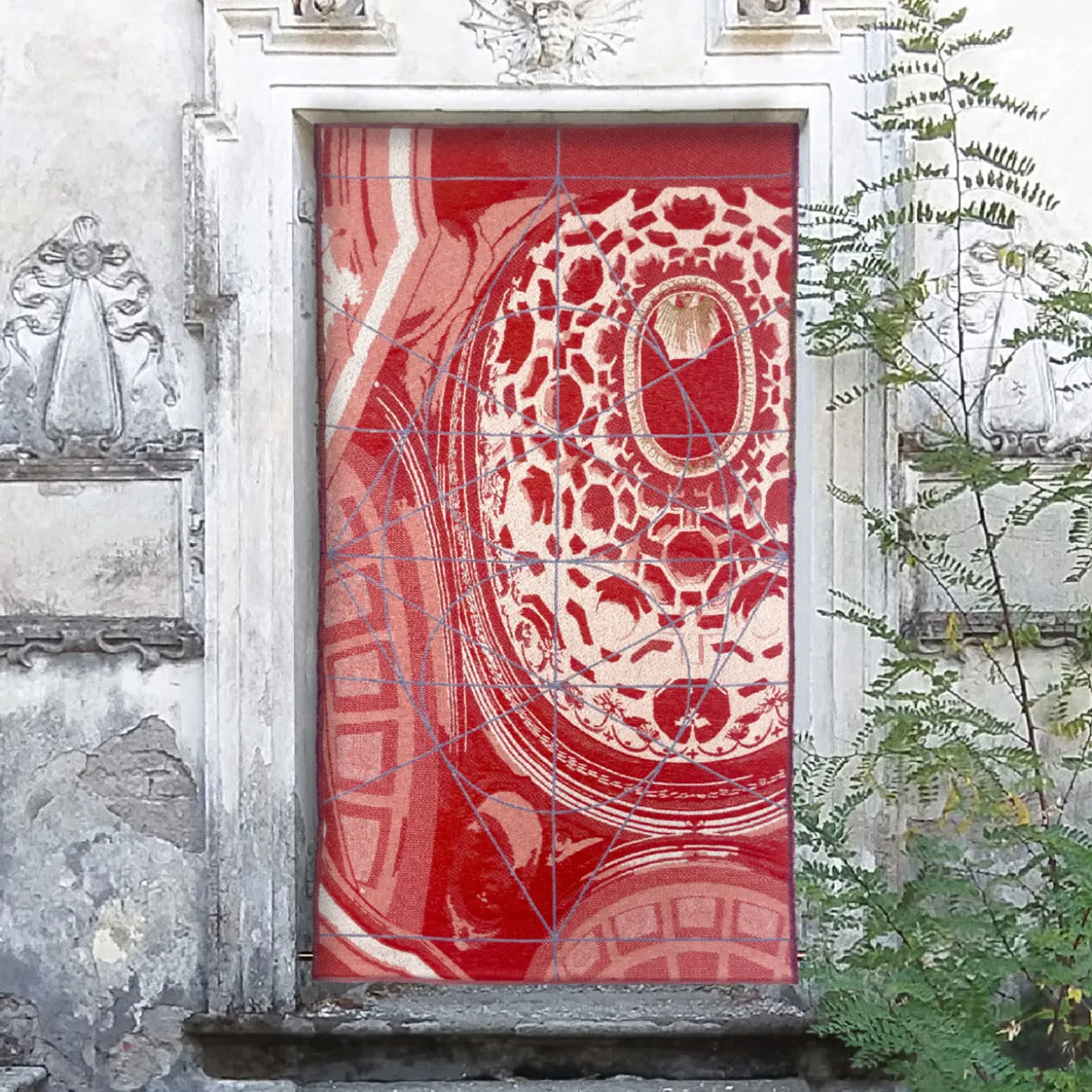 La maestria artigianale dà vita a questa sinfonia visiva, un gioco di rosso bacca e Blitzblau che reimmagina l’opulenza barocca per l’era moderna. L’arazzo bifacciale Borromini non è un semplice tessuto: è una dichiarazione architettonica su tessuto, che traduce la cupola celeste di San Carlo alle Quattro Fontane in una geometria pulsante e astratta. Fili jacquard di lino frisé e cotone tessono forme intricate, mentre linee audaci tagliano la tradizione, fondendo storia e reinvenzione.