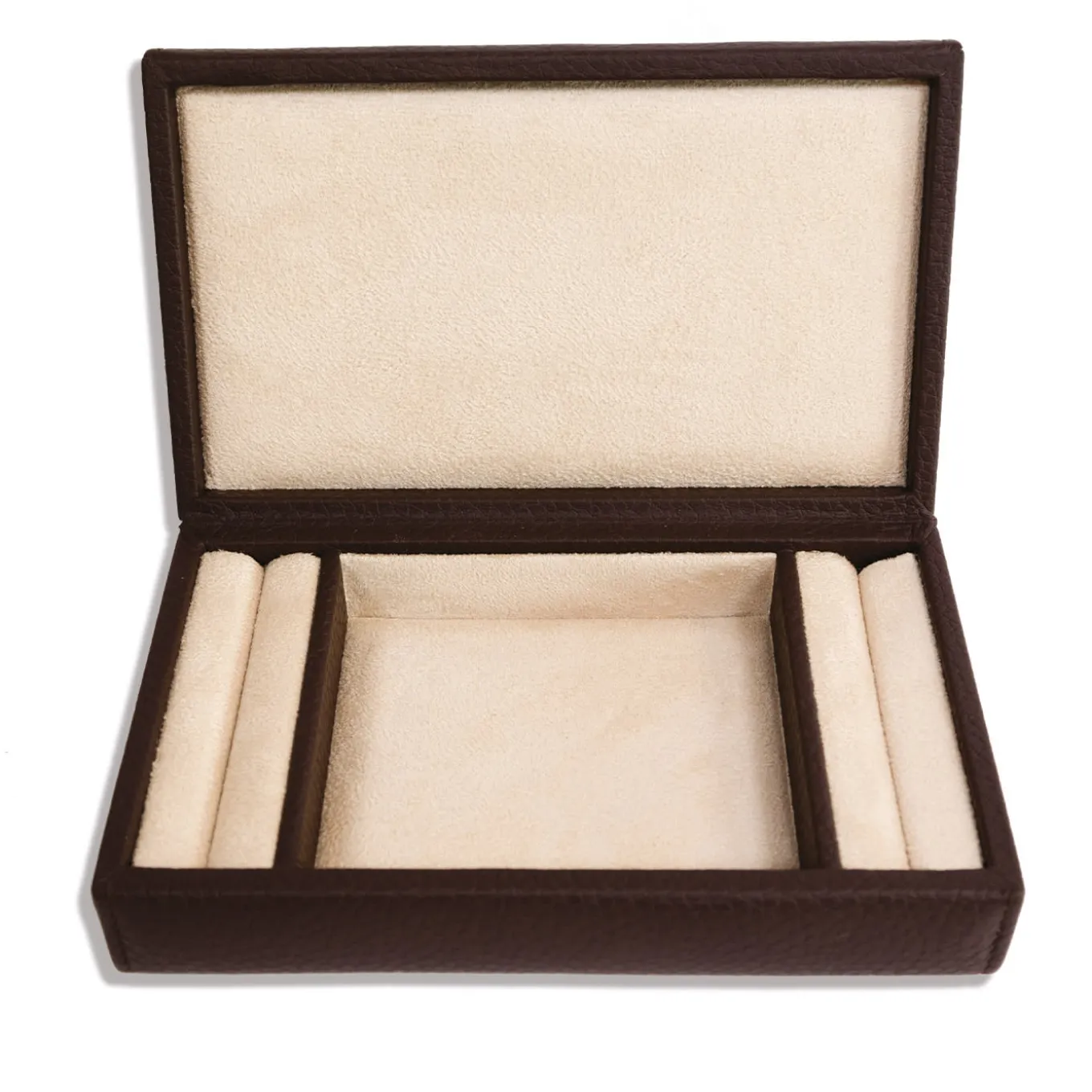 Questo scrigno portagioie, che rappresenta un’eccellenza artigianale, ha una forma allungata e raffinata, realizzata in legno e rivestita in pelle pieno fiore di prima qualità. Caratterizzato da una versatile tonalità marrone, è arricchito da preziosi dettagli in metallo e rivestito internamente in morbida microfibra. Disponibile in una varietà di colori, si prega di consultare il catalogo Artemest per i dettagli.