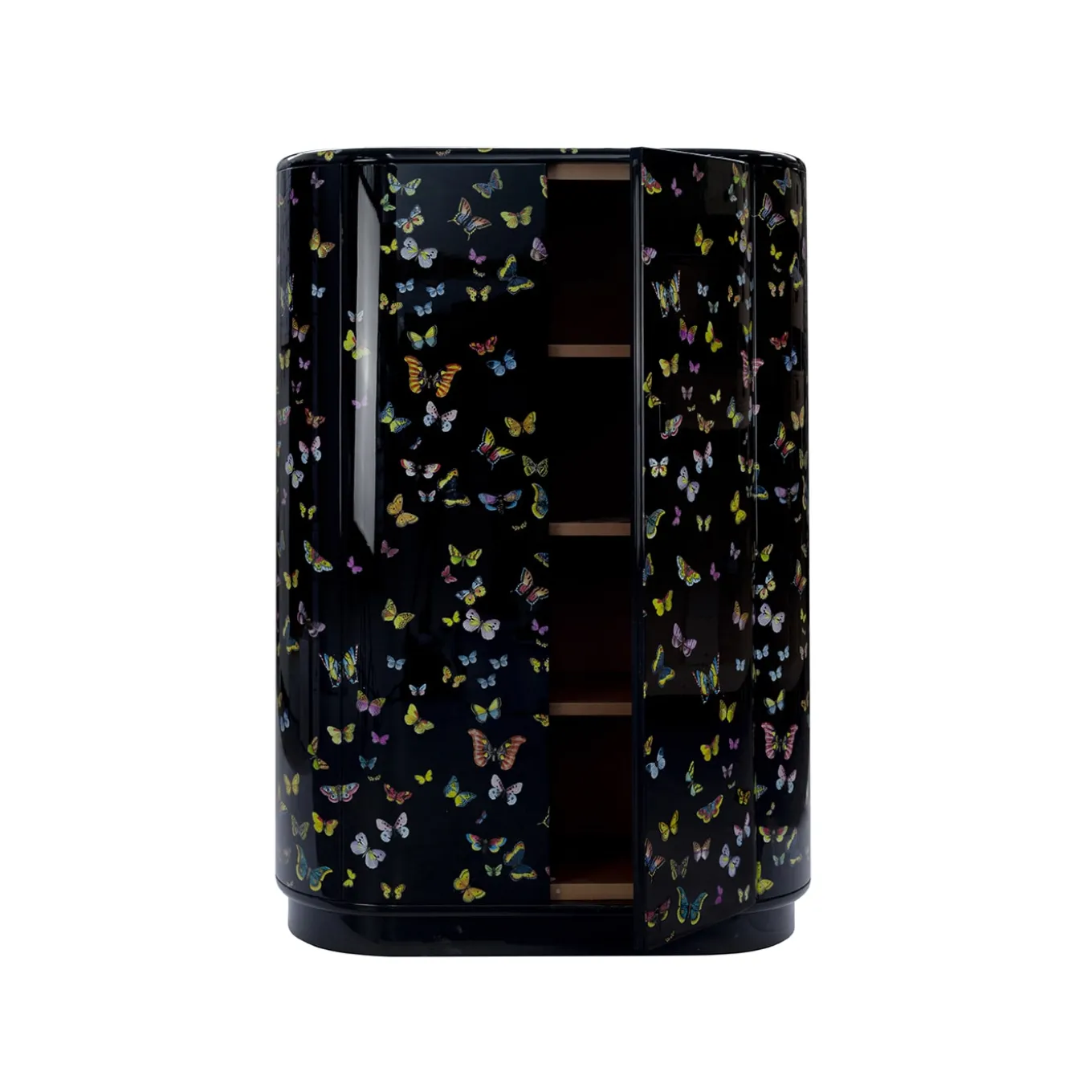 Il mobile curvo Fornasetti è un mobile contenitore in legno serigrafato, dipinto e laccato a mano secondo il metodo tradizionale dell’Atelier. Il motivo è caratterizzato dalle iconiche farfalle colorate di Fornasetti su un elegante sfondo nero. Ogni mobile in legno Fornasetti è un pezzo unico ed eventuali piccole discrepanze tra creazioni simili sono il risultato della lavorazione artigianale.