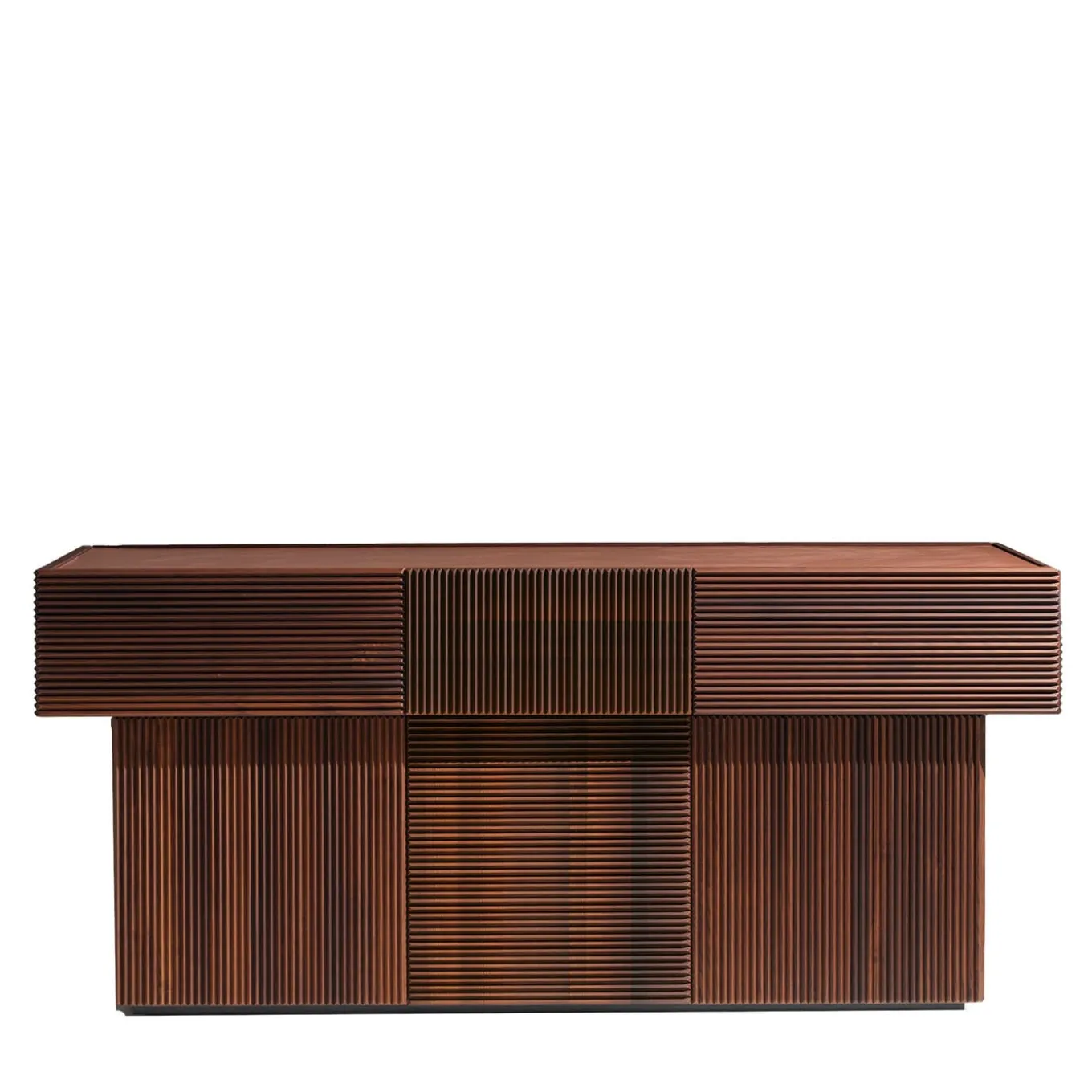 Minimalismo e tradizione artigianale si fondono senza sforzo in questa splendida credenza realizzata a mano in legno con una texture a coste. Composta da tre cassetti sul piano e da tre ante sulla colonna portante, completerà in modo ideale un soggiorno o un salotto in stile contemporaneo. Per ulteriori dettagli su materiali e finiture, consultare il Concierge.