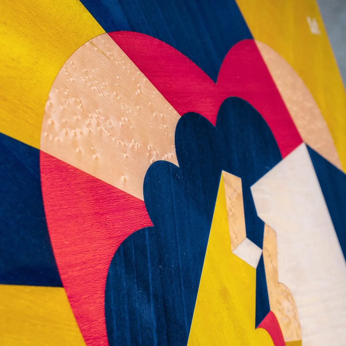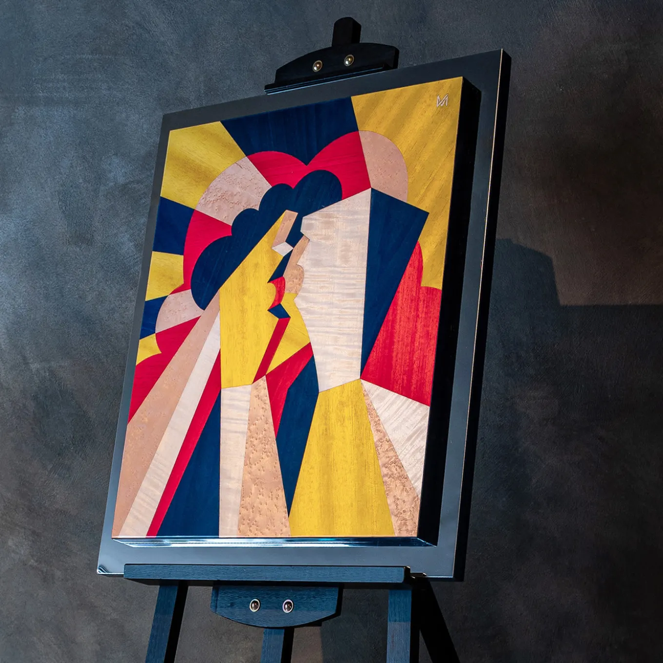 Primo pannello di un avvincente viaggio nella vita di due persone che diventano coppia e poi genitori, Bacio presenta un intarsio geometrico in legno splendidamente lavorato con vibranti tonalità di blu, giallo, fucsia e bianco. Creato dalla designer di StoryArt Marzia Boaglio per l’edizione San Valentino della sua Prima Storia Collection, questo caratteristico oggetto d’arte è impreziosito anche da un acciaio a specchio per un elegante tocco contemporaneo adatto a una parete moderna o minimal.