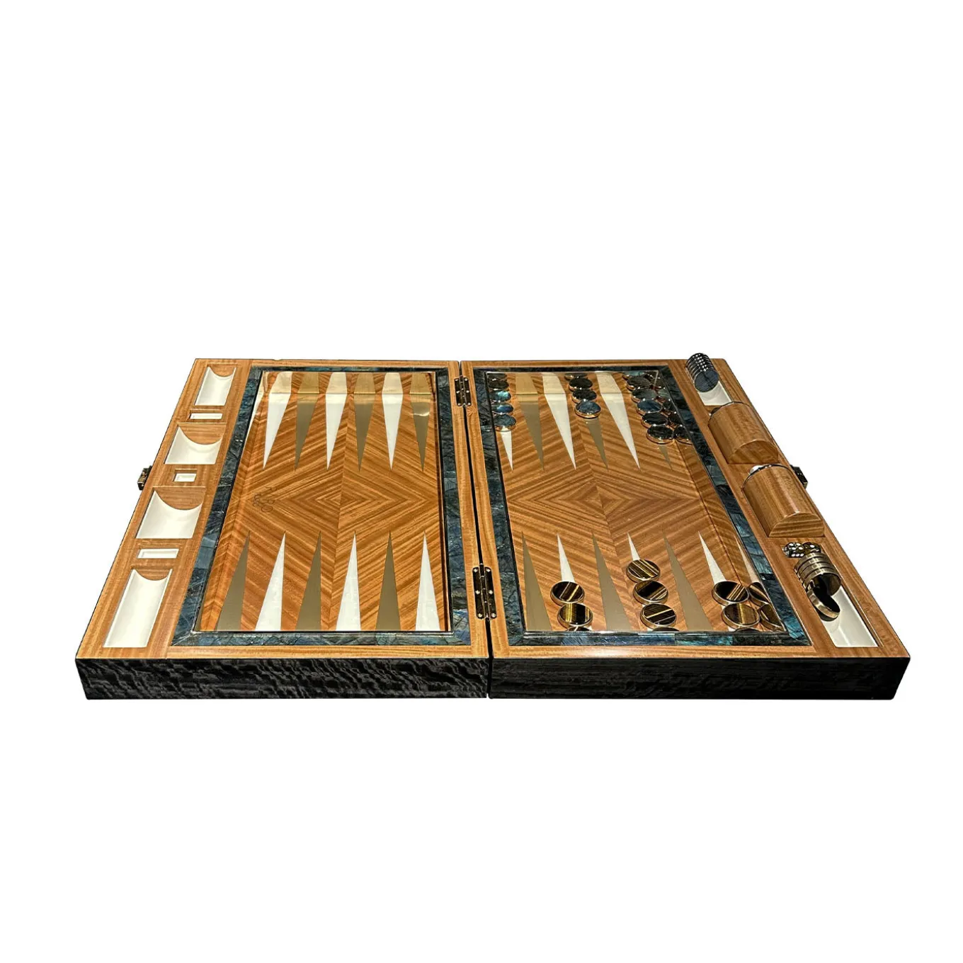 Questo pezzo, completamente fatto a mano, presenta chiusure e cerniere su misura realizzate esclusivamente per il marchio, evidenziando un impegno per dettagli eccezionali e precisione artigianale. L’esterno mostra una sofisticata intarsio di pregiate essenze legnose—tra cui eucalipto frisé grigio, acero sbiancato e citronnier—combinato con accenti in ottone spazzolato. L’interno è arricchito con madreperla bianca luminosa e un bordo in mosaico fatto a mano in labradorite iridescente. I pezzi da gioco includono 15 token in oro satinato abbinati a occhio di tigre e 15 token in oro lucido abbinati a labradorite.
