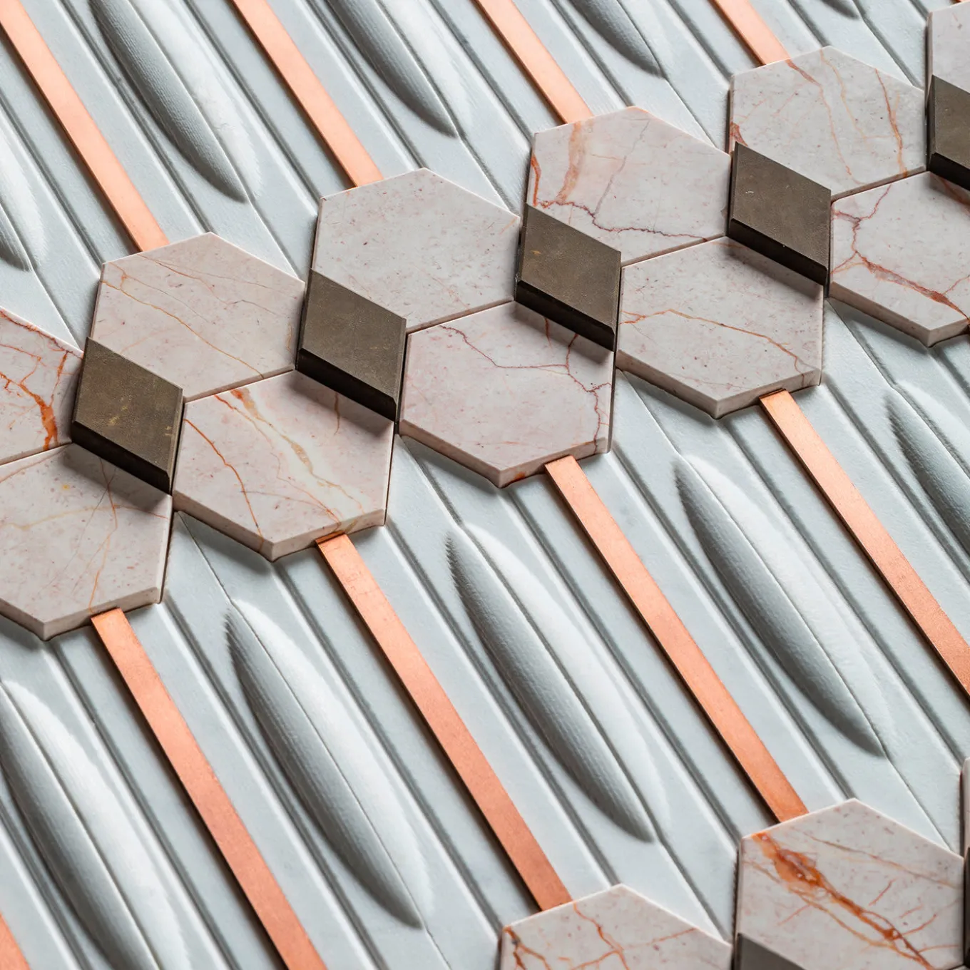 Richiamando l’antica storia e l’arte bizantina, questo delicato bassorilievo fa parte della Collezione Bisanzio. È realizzato in marmo bianco di Carrara e ornato da esagoni in marmo rosa lucido, rombi in pietra pece con finitura levigata e strisce di rame satinato. Questa splendida decorazione evoca tempi antichi, poiché Byzas è il figlio di Poseidone nella mitologia greca e fondatore dell’antica Bisanzio. La dimensione di una singola piastrella è di 30x16x2 cm e ogni piastrella è personalizzabile nelle dimensioni, si prega di chiedere al Concierge per i dettagli.