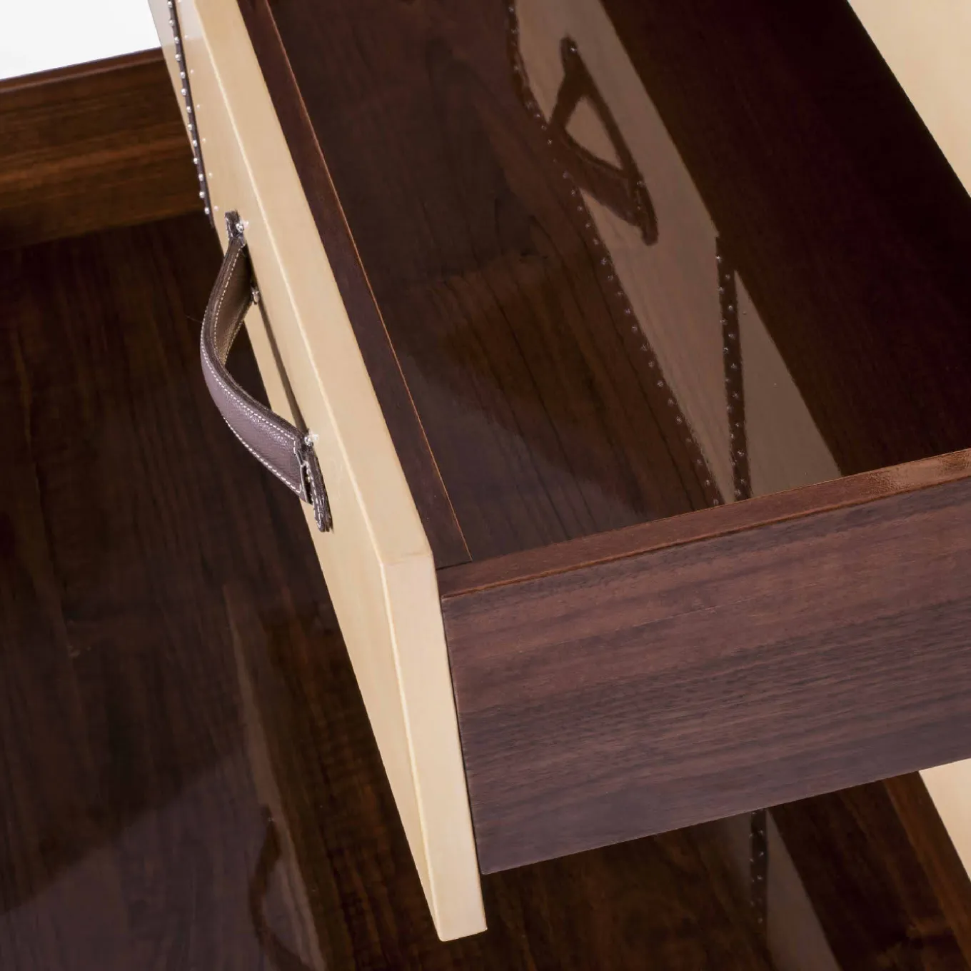 Questo raffinato baule evoca il design dei ruggenti anni Venti e può essere esposto al centro di una stanza. La struttura è in legno di pioppo con ruote alla base per una facile mobilità e l’esterno è rivestito in pelle. L’interno contiene quattro cassetti con sistema di ammortizzazione “blumotion”, in legno di noce italiano con finitura lucida (è possibile aggiungere un rivestimento in microfibra). Tutte le maniglie sono in ottone pieno con finitura oro e nichel.