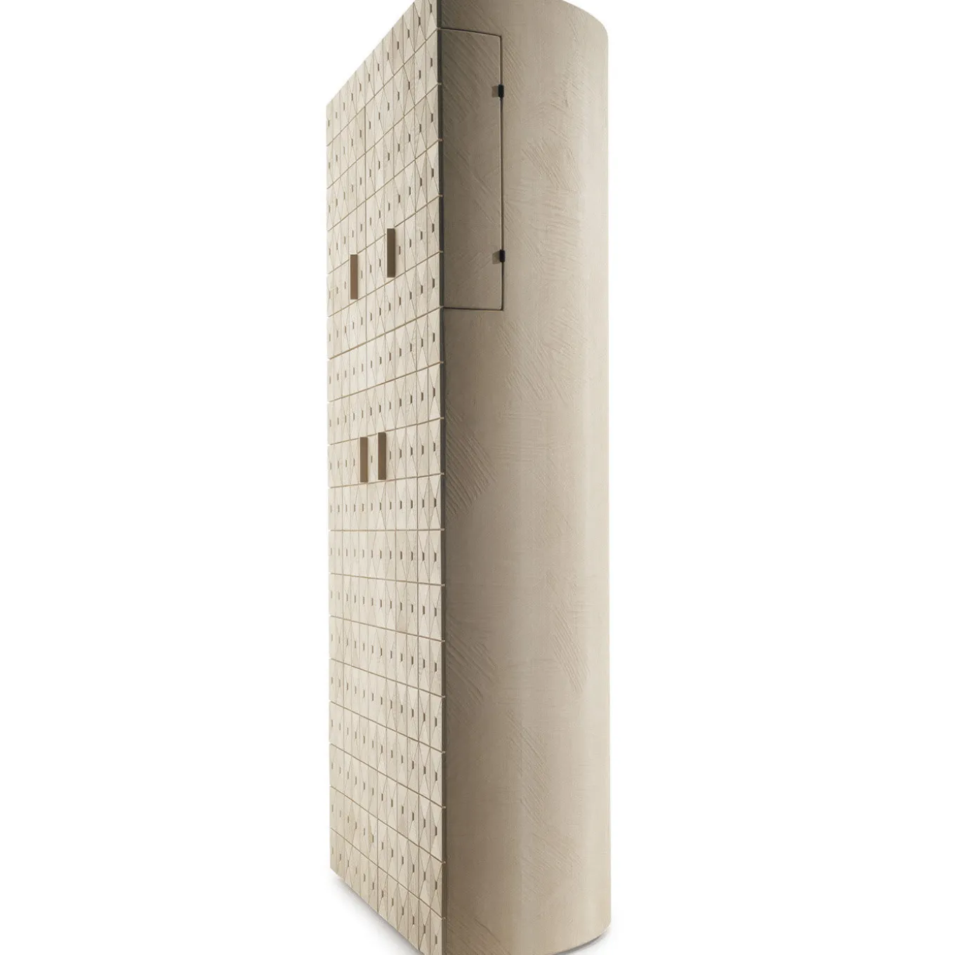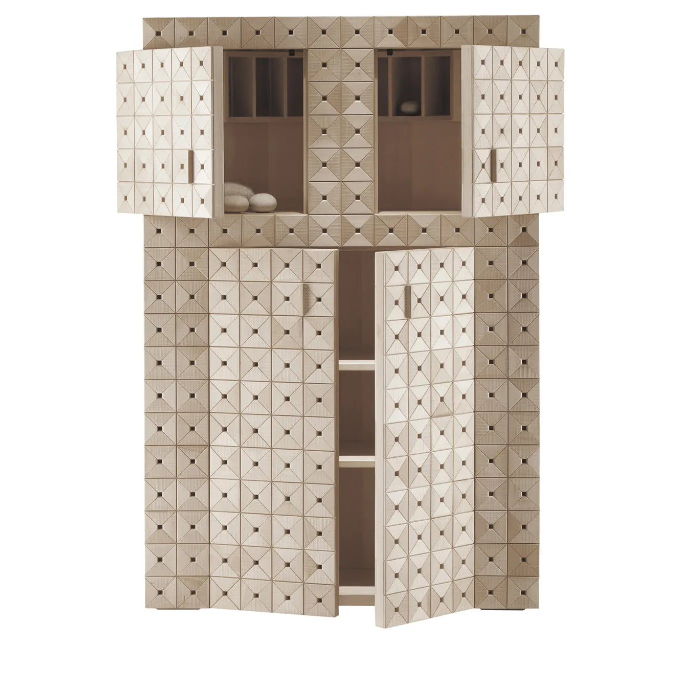 Abile vetrina di artigianato, questo mobile scultoreo sarà al centro della scena in un interno contemporaneo o rustico. Realizzato e intagliato a mano con una pialla, presenta quattro porte e due finestre che si aprono a doppio pannello oscillando orizzontalmente, arricchite da maniglie in legno a vista con chiusure magnetiche e cerniere metalliche nascoste. Ripiani rimovibili e piccoli vani a giorno completano il pezzo.