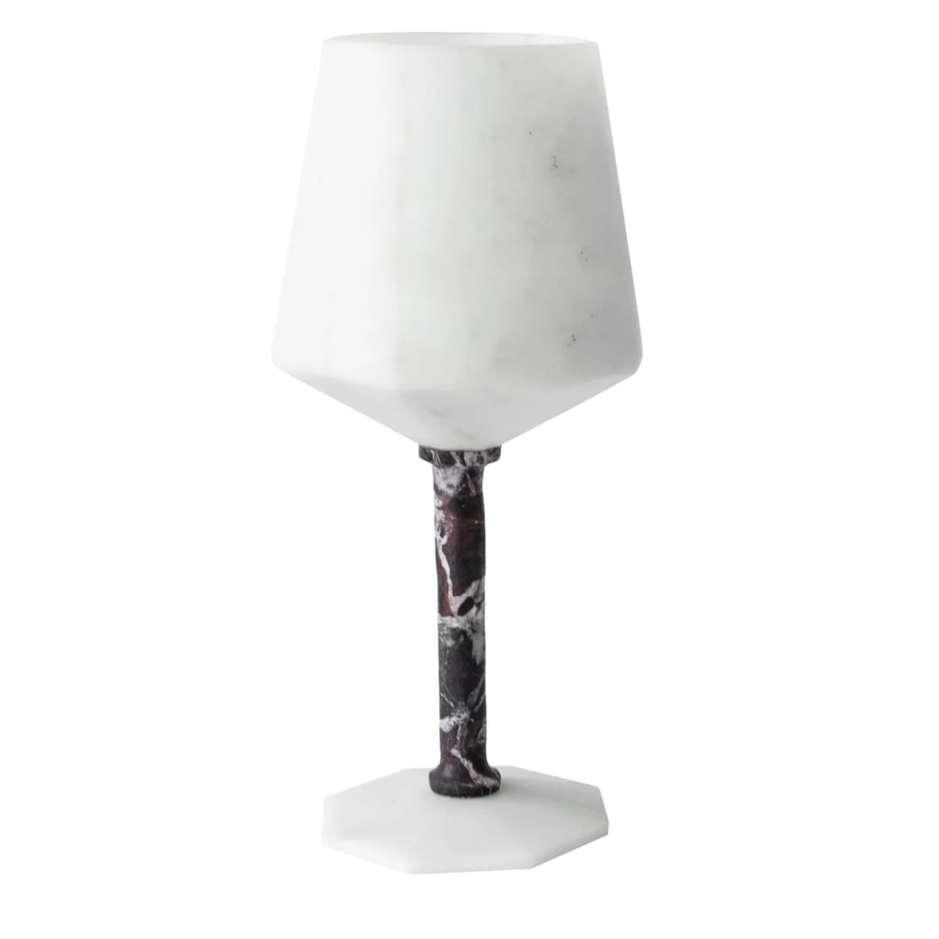 Bicchiere da vino in marmo bianco satinato di Carrara e rosso Levanto. Ogni pezzo è in qualche modo unico (ogni blocco di marmo è diverso per venature e sfumature) e realizzato a mano da artigiani italiani specializzati da generazioni nella lavorazione del marmo. Lievi variazioni di forma, colore e dimensione sono da considerarsi garanzia di una creazione artigianale. È importante non usare limone o aceto, pulire solo con acqua e sapone naturale (come il sapone di Marsiglia), non mettere in lavastoviglie.
