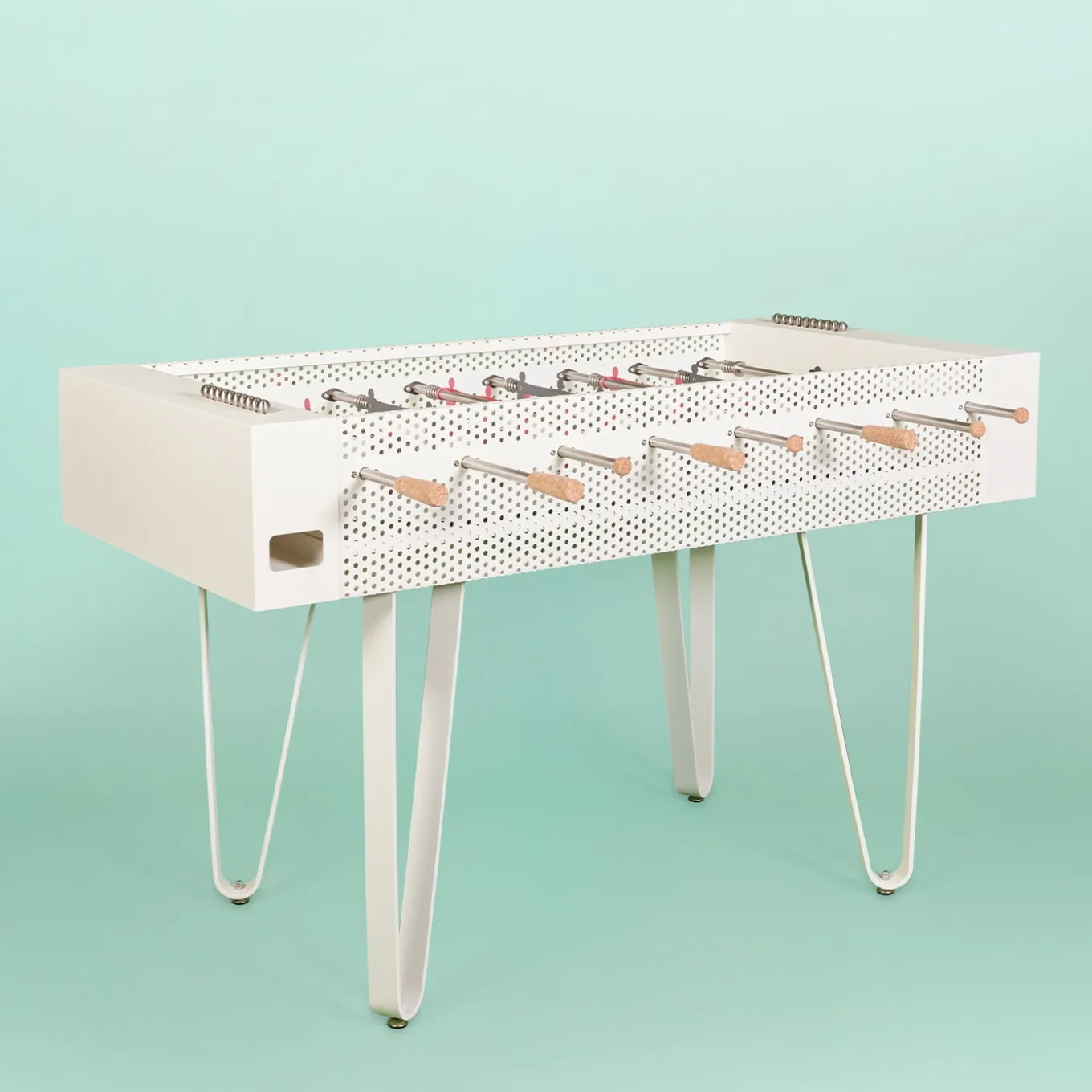 Il calciobalilla Joie combina un elegante corpo in lamiera forata bianca con giocatori grigi e fucsia. Presenta dettagli accurati, tra cui le impugnature in sughero e la pallina, per un comfort e un’esperienza tattile migliori. Costruito interamente in metallo con componenti in acciaio inox, il tavolo poggia su gambe eleganti che offrono stabilità e fascino moderno. È disponibile anche una versione per esterni, che lo rende una scelta raffinata per spazi di gioco attenti al design. Altre opzioni di colore sono disponibili nel catalogo Artemest. Per maggiori dettagli, contattare il Concierge.