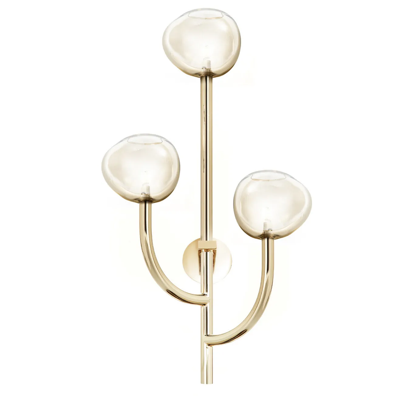 Questa splendida applique è caratterizzata da un design semplice ma singolare, che sintetizza senza sforzo tradizione e innovazione, artigianato raffinato ed estro moderno. Montata su una struttura in ottone con finitura dorata, composta da un braccio dritto e due curvi, è caratterizzata da tre paralumi ipnotici realizzati a mano in vetro color miele, che mostrano la silhouette irregolare di una bolla di sapone. Disponibile in altre finiture su richiesta al Concierge.