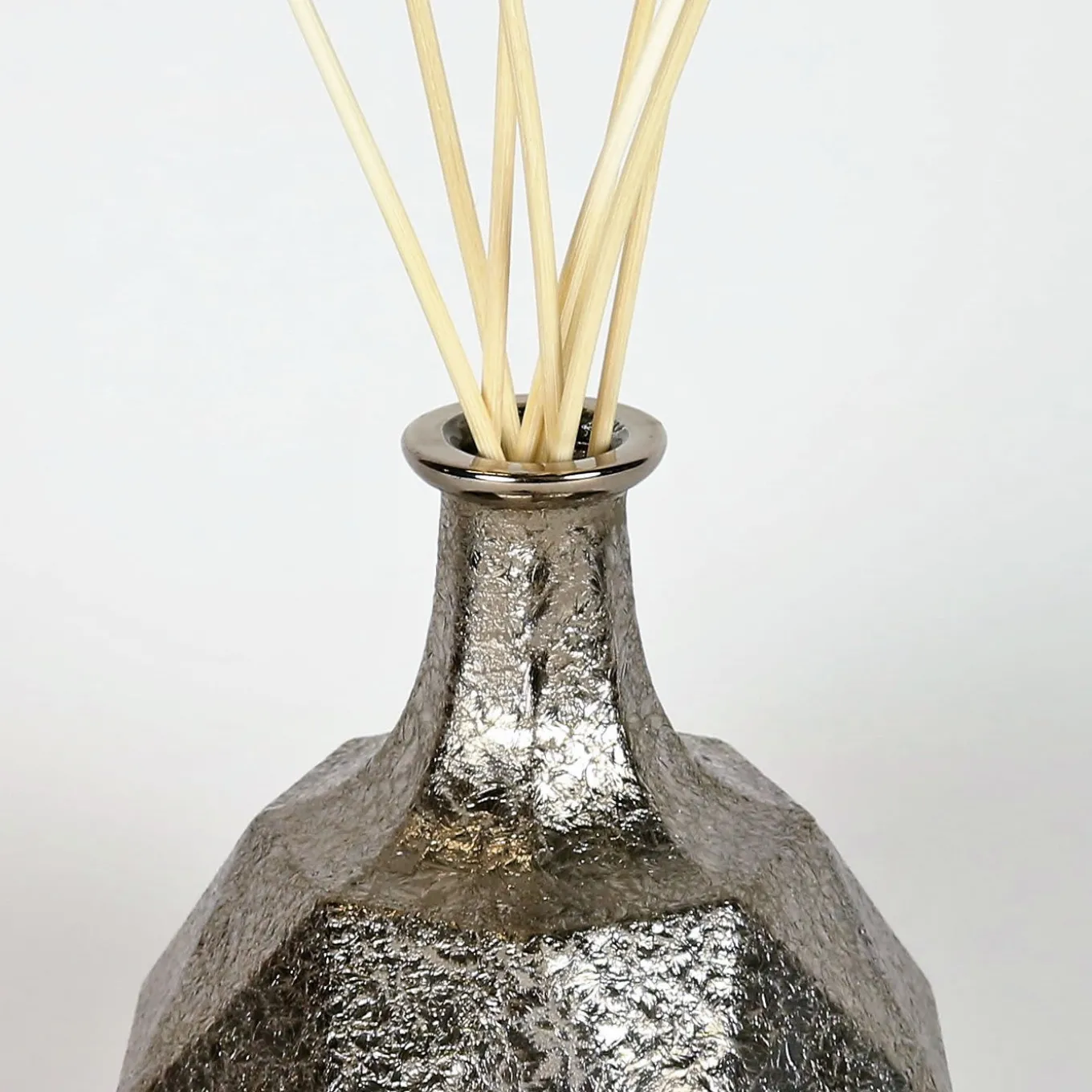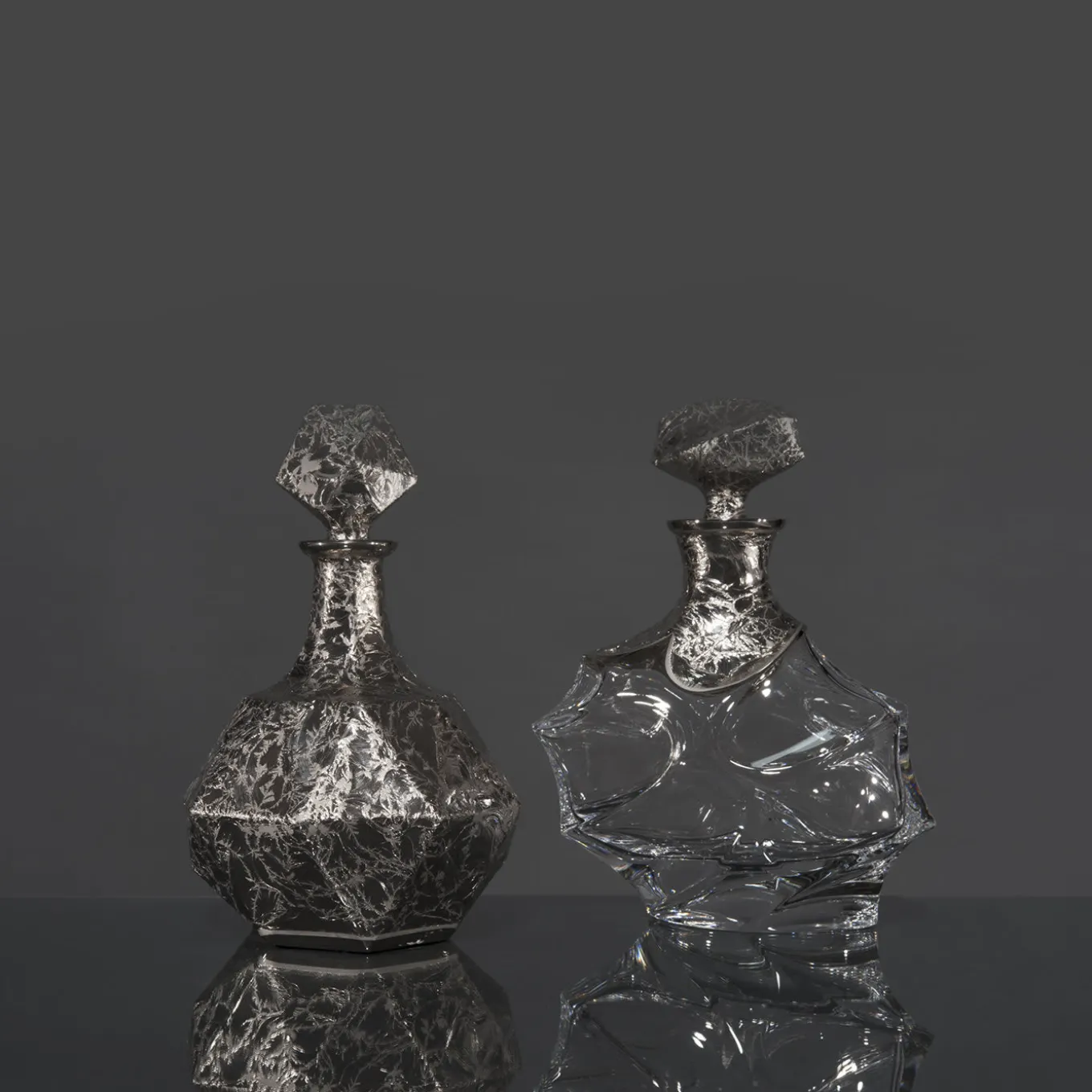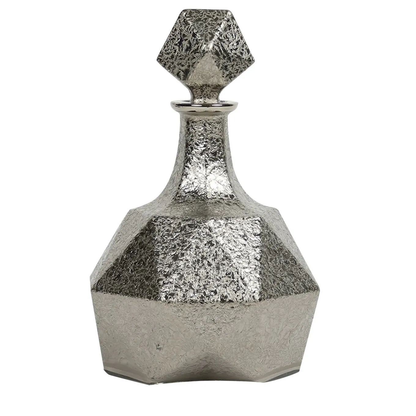 Parte della collezione Capriccio, questa bottiglia è stata interamente realizzata in cristallo, scolpita in vetro massiccio a forma di pietra diamantata sfaccettata. La sua texture unica è stata interamente dipinta a mano con il platino, compreso il coperchio, per creare un effetto suggestivo che completerà qualsiasi arredamento con la sua sensazione di eleganza e lusso. Particolarmente adatto per conservare e servire whisky e altri liquori, questo pezzo può essere abbinato ad altri della stessa serie per un look più completo.