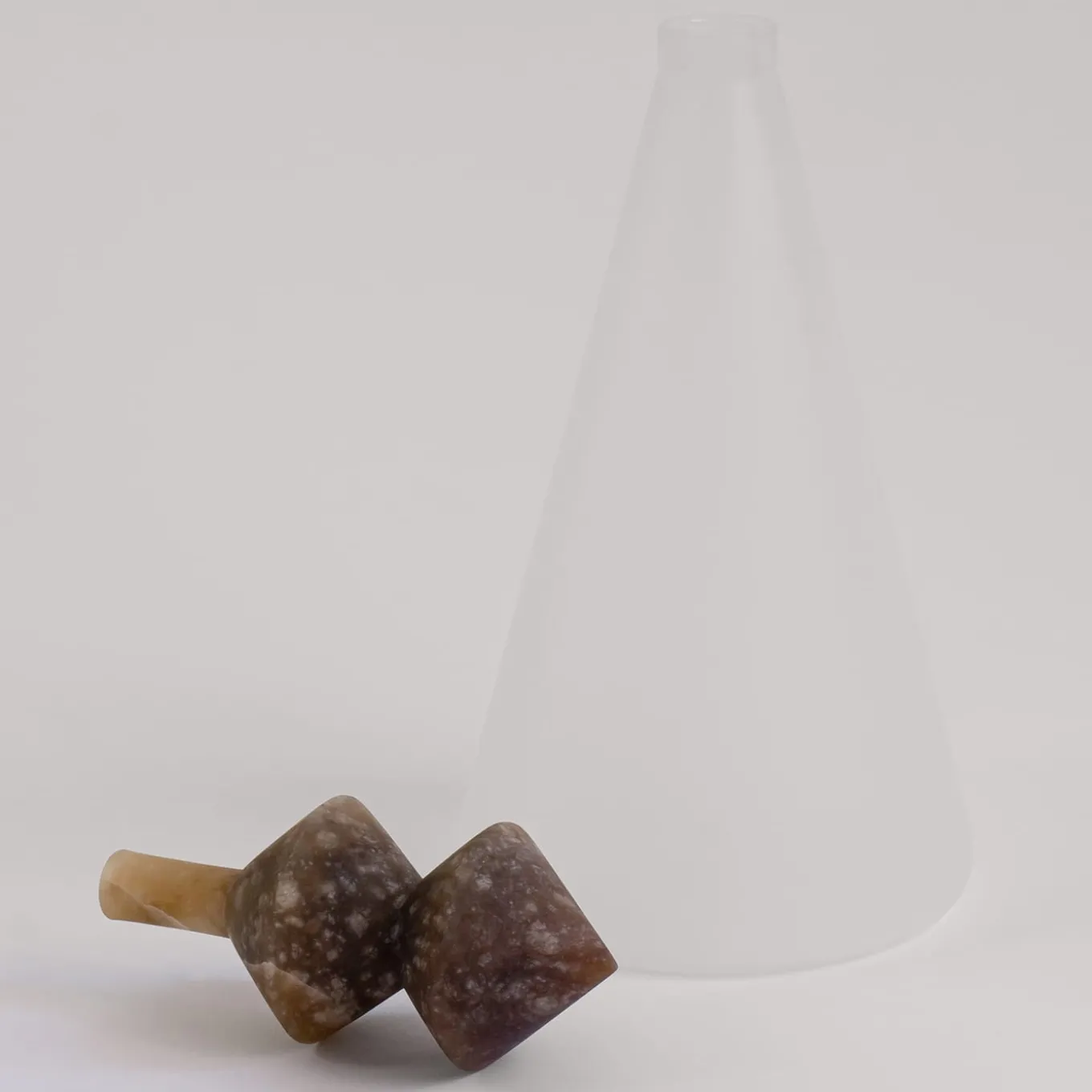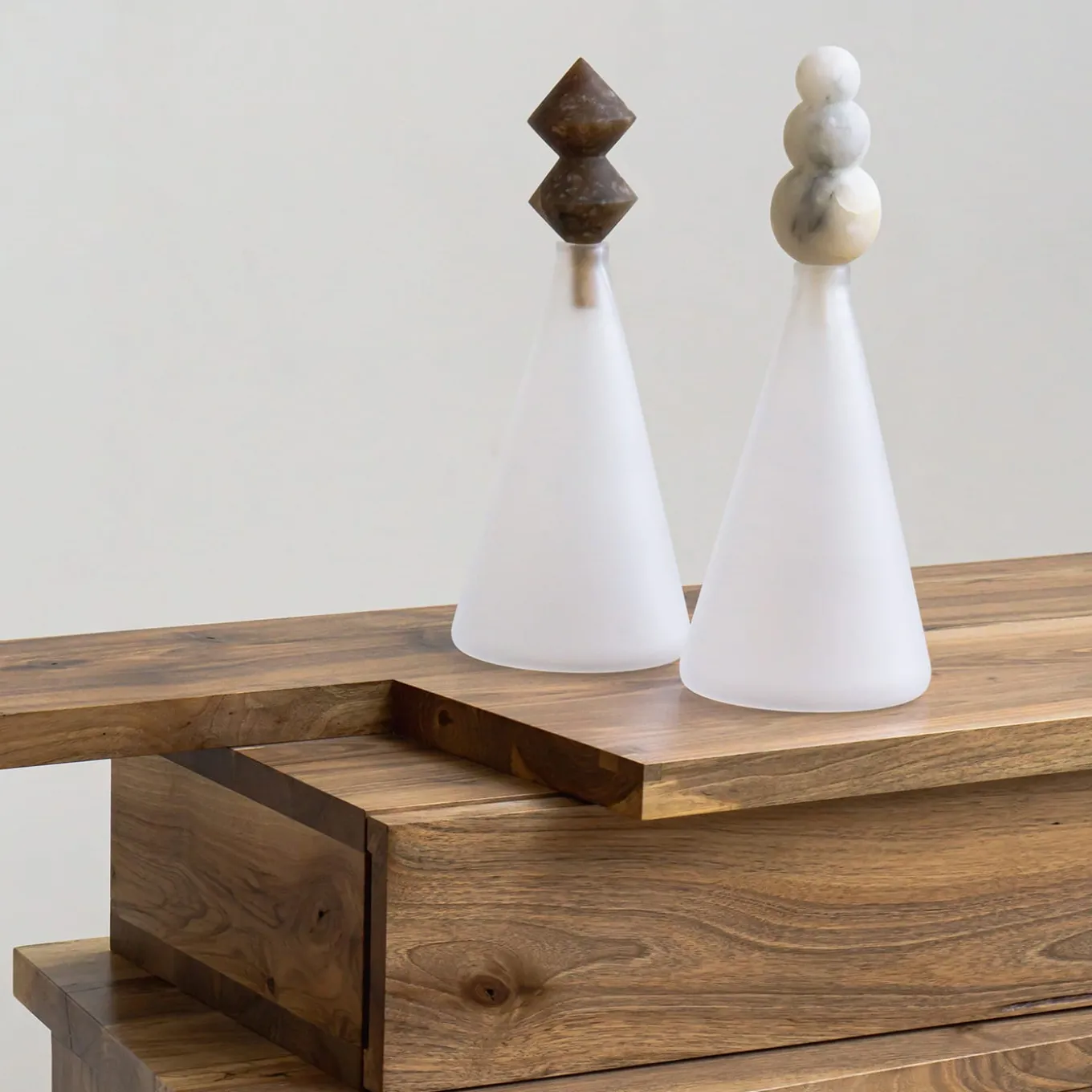 La bottiglia KITE V2 affascina con il suo design raffinato, incarnando un’estetica moderna che valorizza qualsiasi spazio. Questo esclusivo pezzo in edizione limitata è realizzato in vetro bianco sabbiato e alabastro Agata, creando un suggestivo gioco di texture e traslucidità. Sormontata da un tappo scultoreo simile a una gemma che poggia su un supporto di vetro satinato, la bottiglia emana eleganza e precisione. Ogni pezzo è contrassegnato singolarmente da una targhetta metallica numerata progressivamente, che ne certifica l’autenticità e il valore collezionistico.