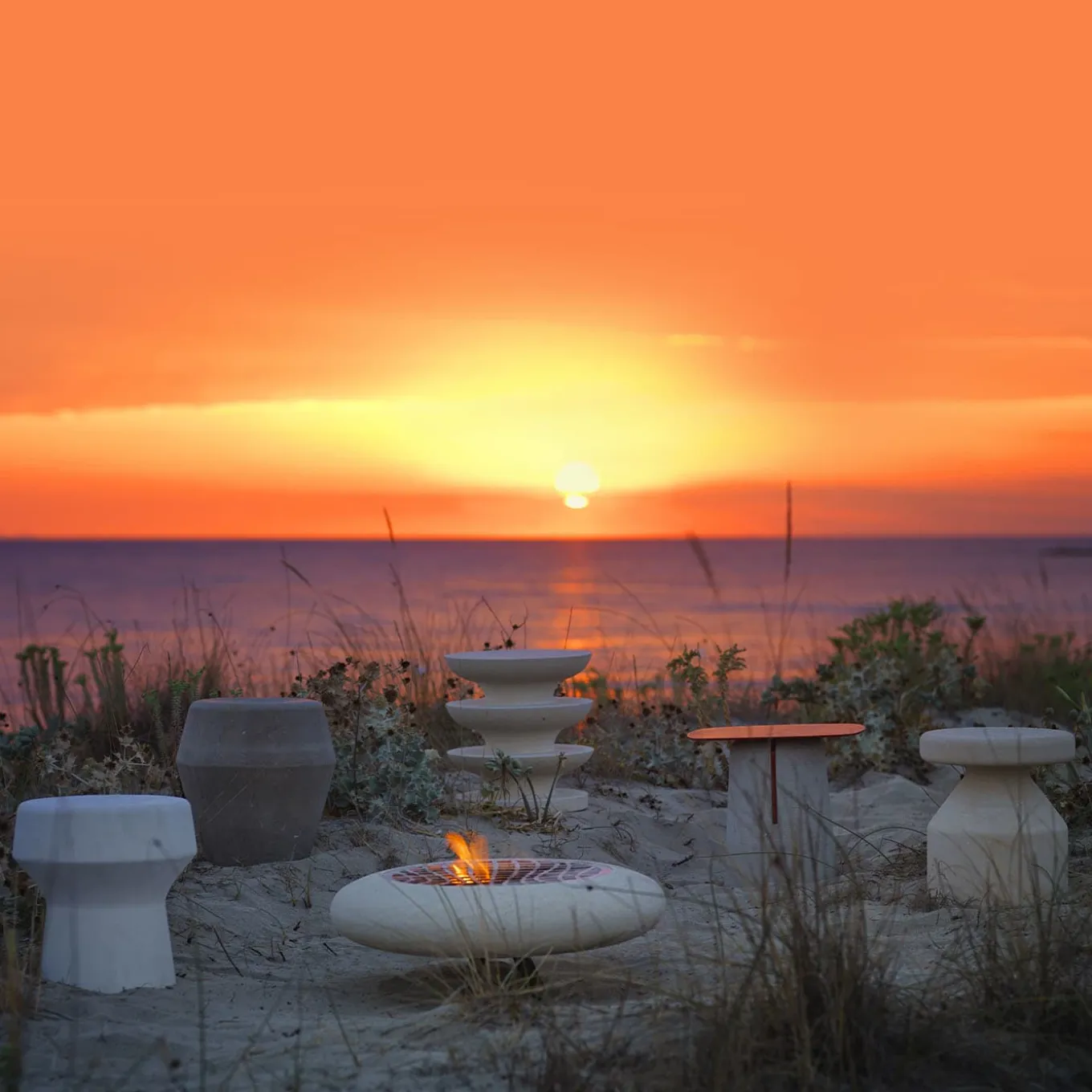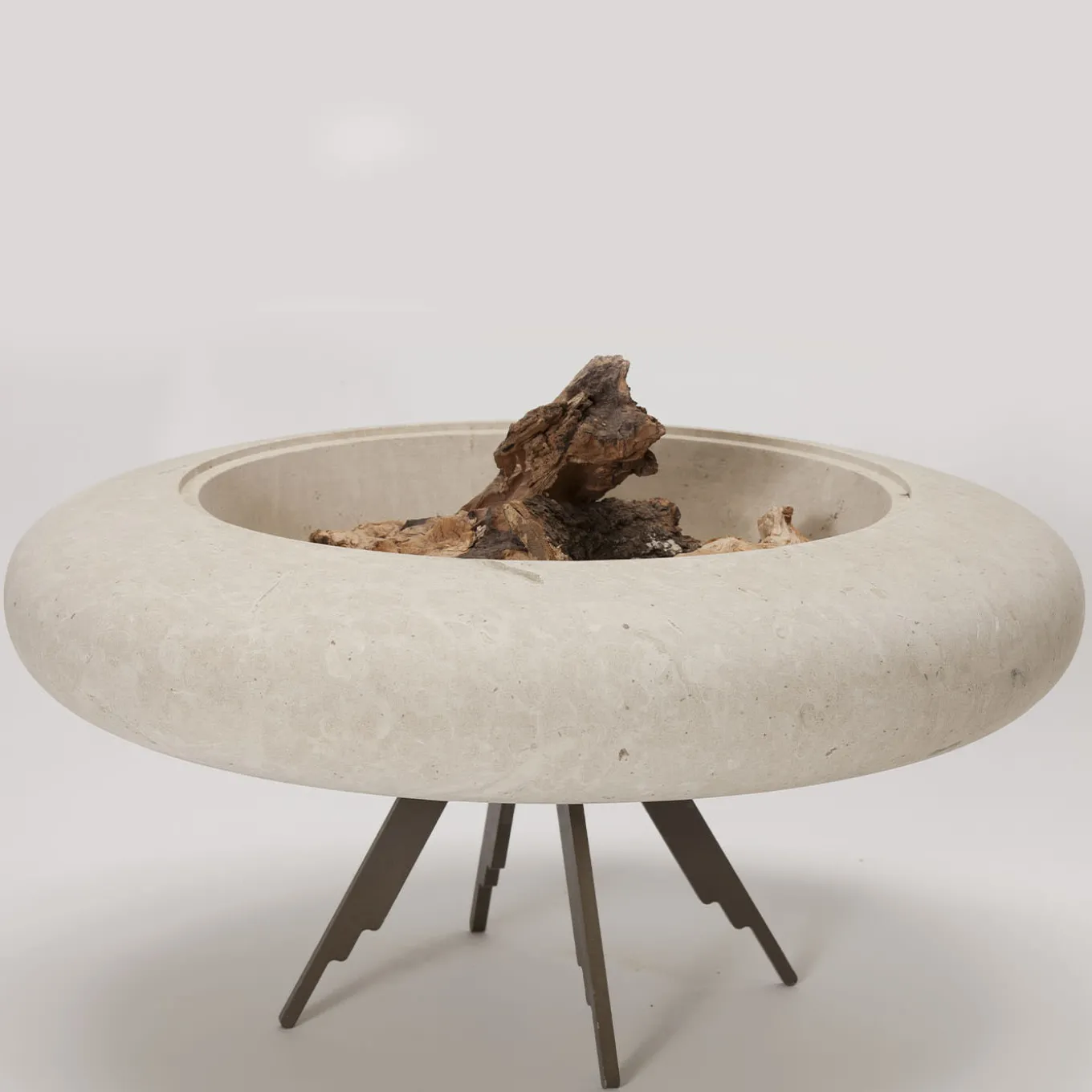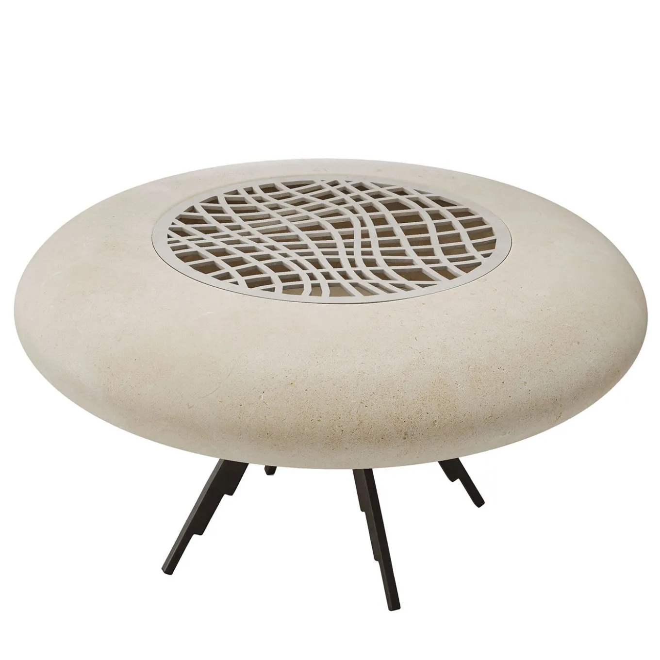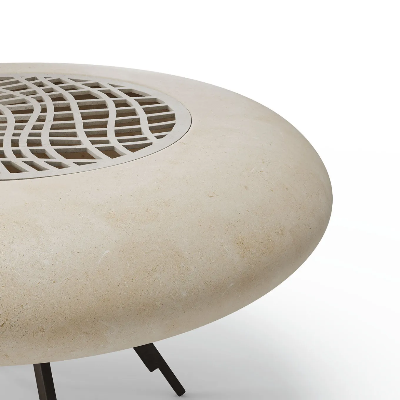 Ideale per riunirsi con gli amici per rilassanti chiacchierate notturne, questo braciere è un’ode al dinamismo geometrico. Il suo audace corpo in pietra refrattaria è delineato esclusivamente da curve avvolgenti e poggia su quattro piedini metallici sagomati per un’intrigante combinazione di pieni e vuoti. Il design si distingue per le singolari traiettorie che la pietra sfoggia naturalmente, ed è completo di una griglia che cattura l’attenzione con il suo design fluido e irregolare.