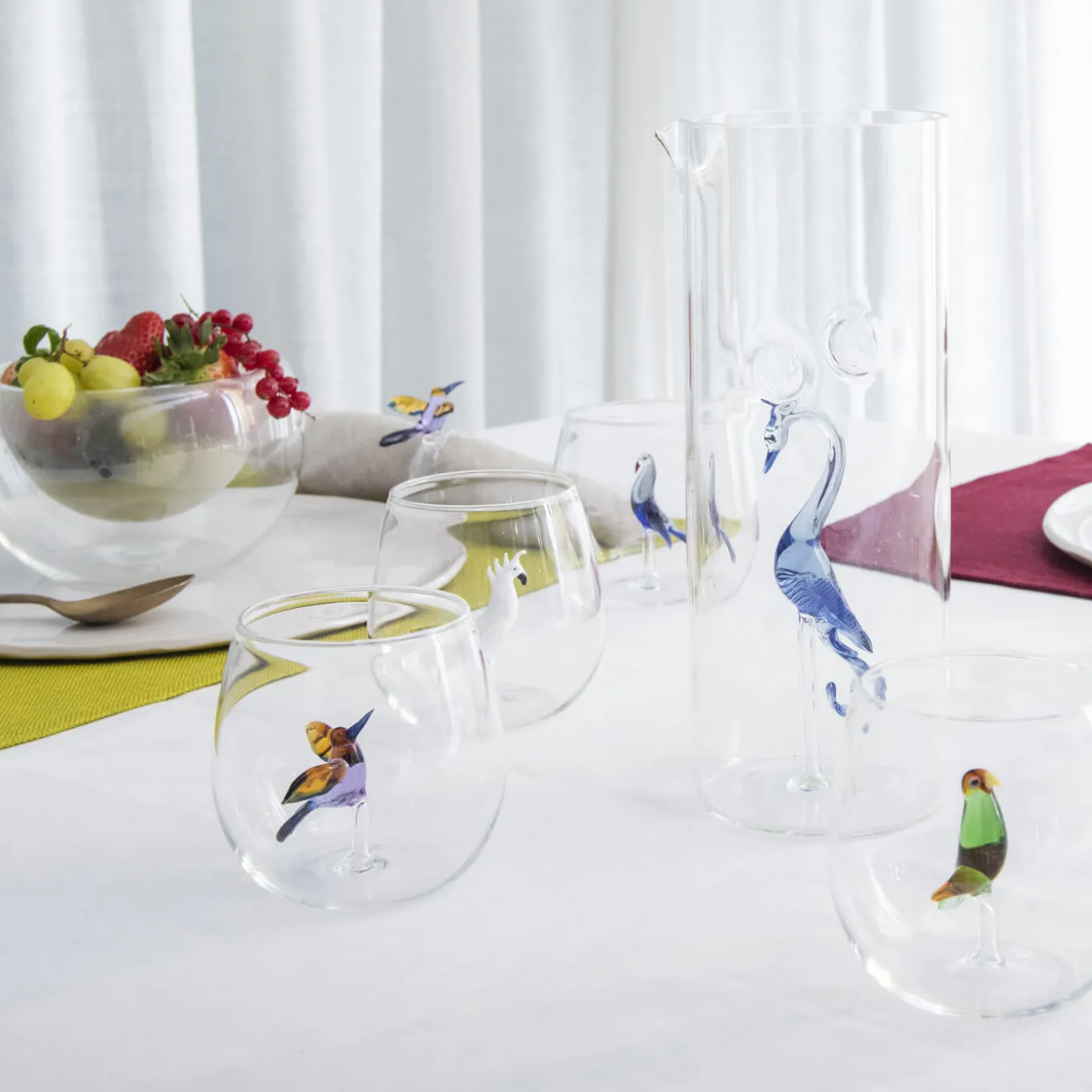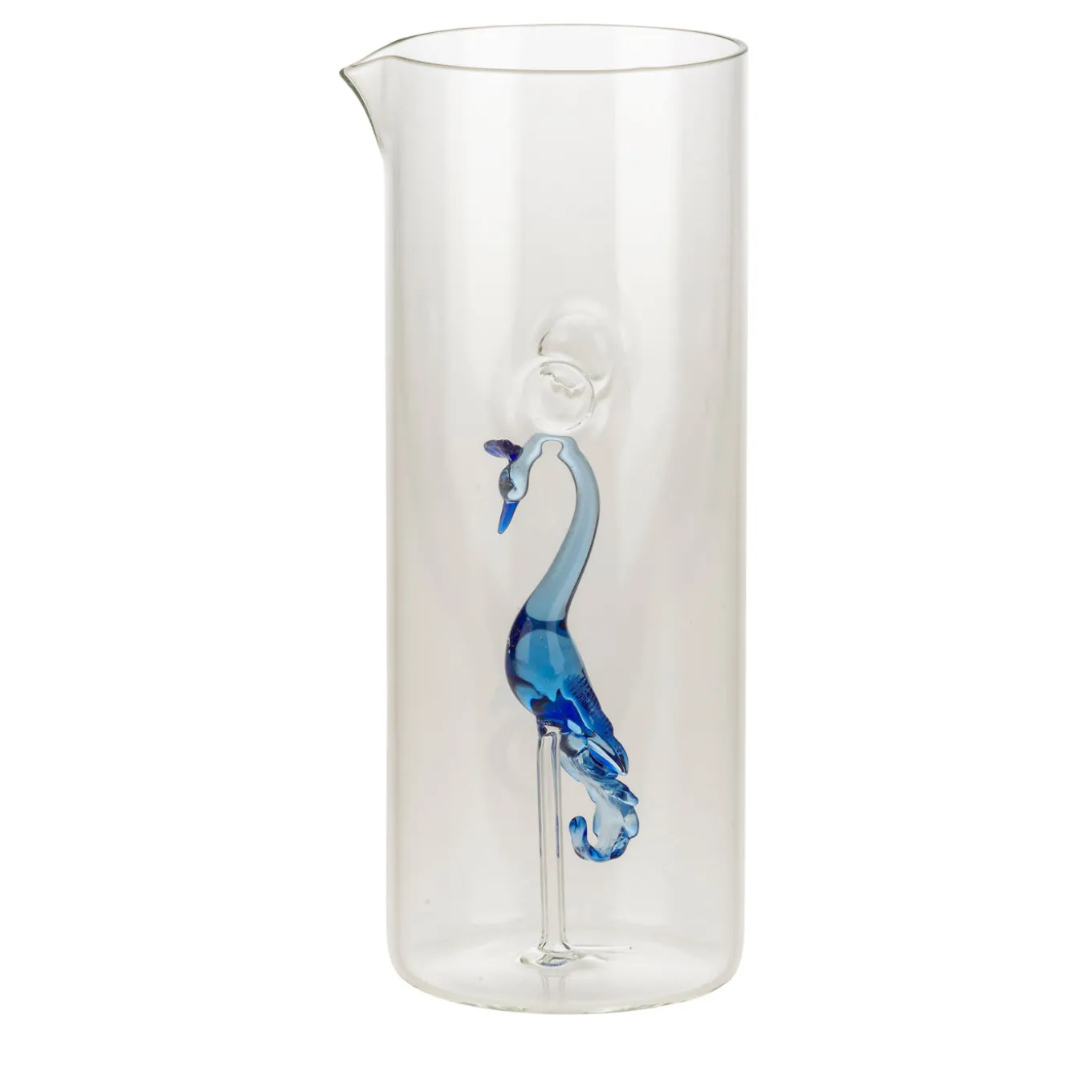 Parte della collezione Tropical, questa brocca in vetro soffiato a bocca presenta una silhouette alta e slanciata, con due piccole rientranze sui lati per facilitarne la presa e uno squisito pavone blu raffigurato all’interno con un collo delicatamente ricurvo. Moderno e versatile, questo pezzo può essere abbinato ai bicchieri della stessa collezione e ai portatovaglioli a forma di uccello per aggiungere un accento esotico e colorato su una tavola informale o durante occasioni di intrattenimento a tema.