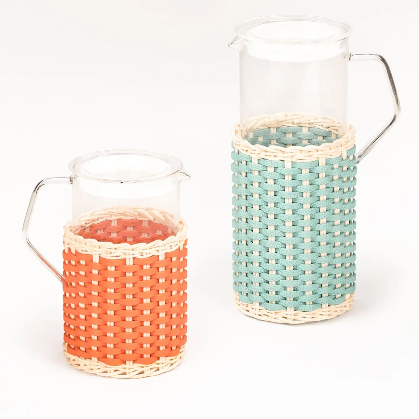 Vetro borosilicato trasparente parzialmente vestito di pelle e rattan intrecciati. Dotato di coperchio in vetro con anello in silicone e corpo in vetro resistente al calore, può essere utilizzato per bevande calde e fredde. Disponibile solo con rattan naturale (RT06) abbinato a golf o nappa. (1,2 Lt)