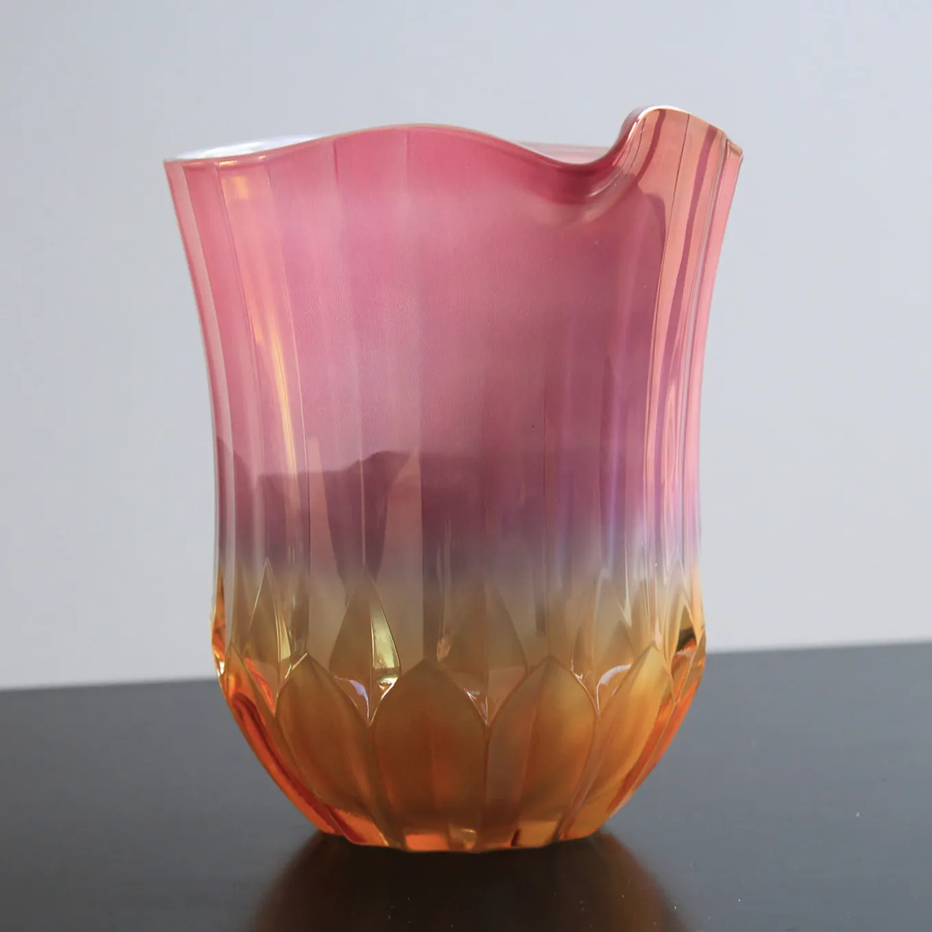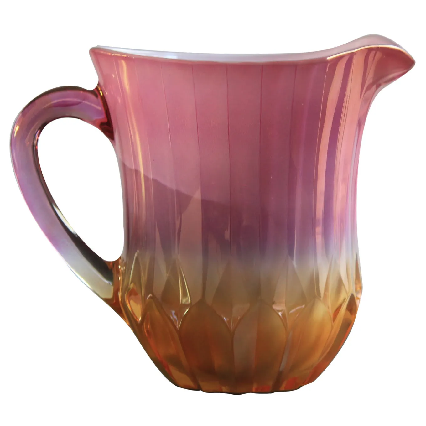 Questa accattivante brocca è una testimonianza della tradizione vetraria e del moderno equilibrio visivo. Sapientemente realizzata a mano in vetro, ha una silhouette svasata con una base geometrica sfaccettata e lati scanalati verticalmente che conducono a un ampio bordo di versamento e a un manico curvo. Il gradiente di colore bianco e arancione della brocca in vetro contrasta elegantemente con il manico in vetro multicolore, creando un contrasto dinamico di colori e texture che conferisce al pezzo un fascino unico e moderno. Questa brocca aggiungerà un tocco di raffinata eleganza alle tavole di tutti i giorni e a quelle festive. Può contenere fino a 40 oz.