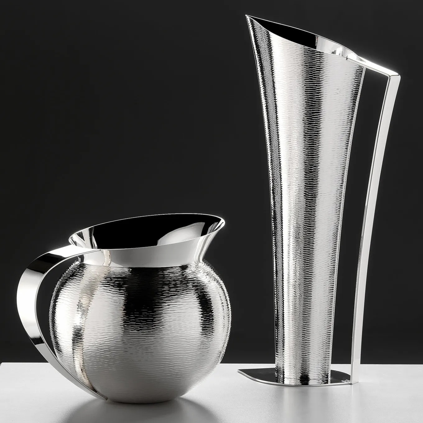 La splendida brocca rotonda, con una lucentezza abbinata a una texture abbagliante, è realizzata elegantemente in lega argentata.