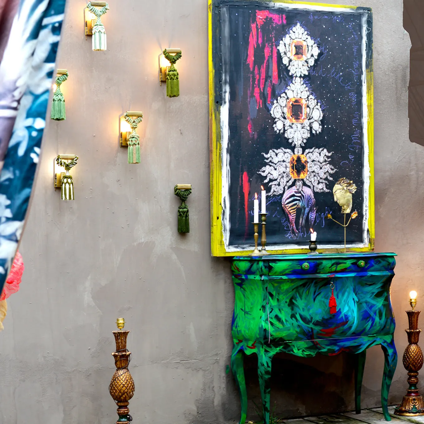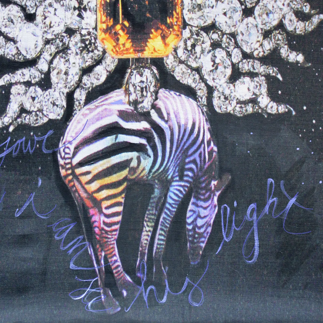 Parte degli elementi decorativi del set de “L’incantatrice di serpenti”, questa tela rende omaggio ai gioielli, simbolo di potere e seduzione. La tela in pura viscosa raffigura tre spille allineate che sorreggono una zebra, il disegno originale stampato in alta definizione e rifinito a mano con pennellate di malva e dettagli pittorici su un fondo blu intenso. La tela è fissata al telaio in legno recuperato dalle assi che reggevano i piani scenici, utilizzando i tipici chiodi a testa quadra usati sui palcoscenici teatrali.