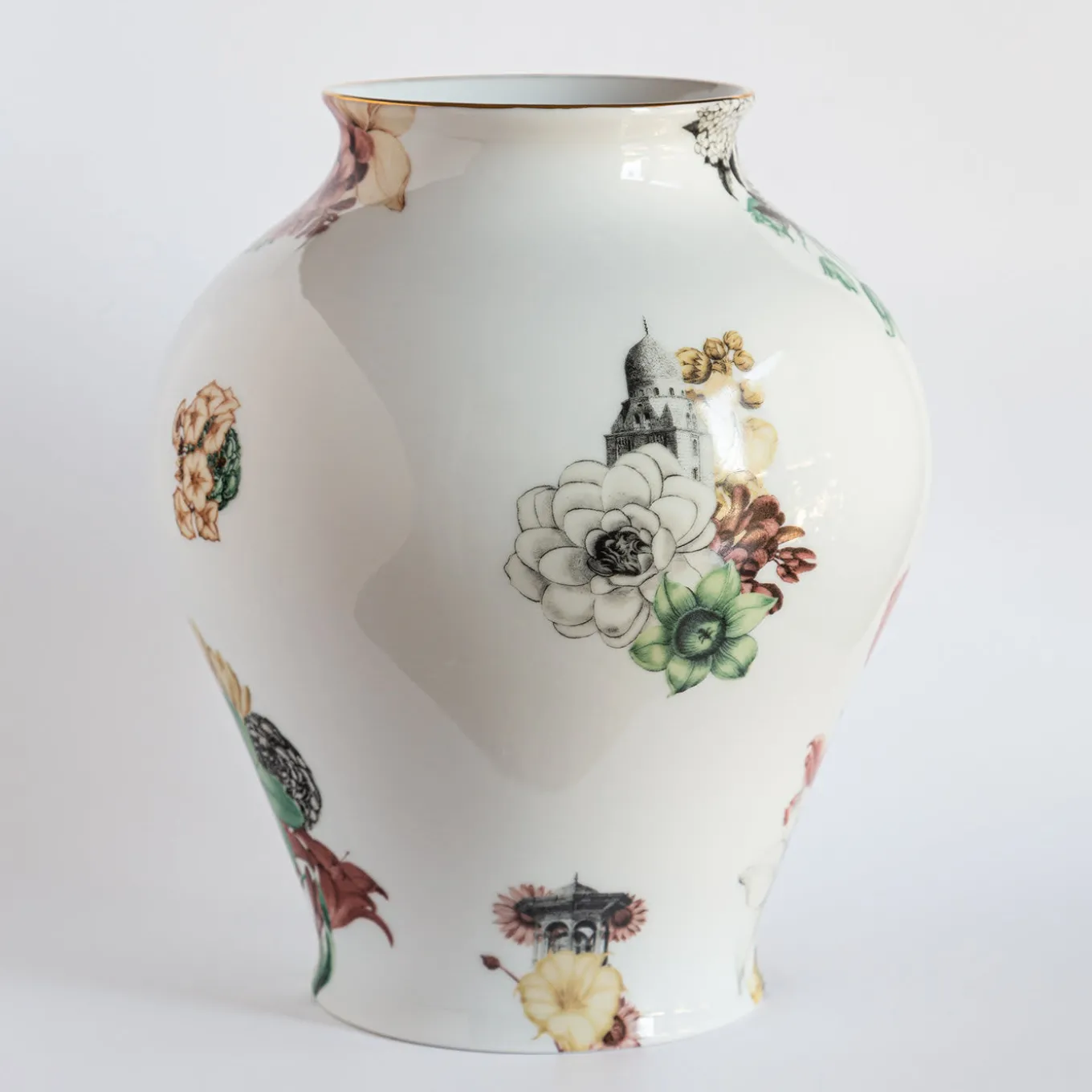 Disegnato da Vito Nesta come parte della sua collezione Grand Tour, questo accattivante vaso in porcellana è caratterizzato da una forma classica rivisitata con un look totalmente contemporaneo. L’inaspettata combinazione di architettura mediorientale e di motivi floreali nelle tonalità del verde, del rosso e del giallo, dipinti a mano sulla superficie bianca e lucida, rende questo vaso un centrotavola accattivante per qualsiasi tavola.