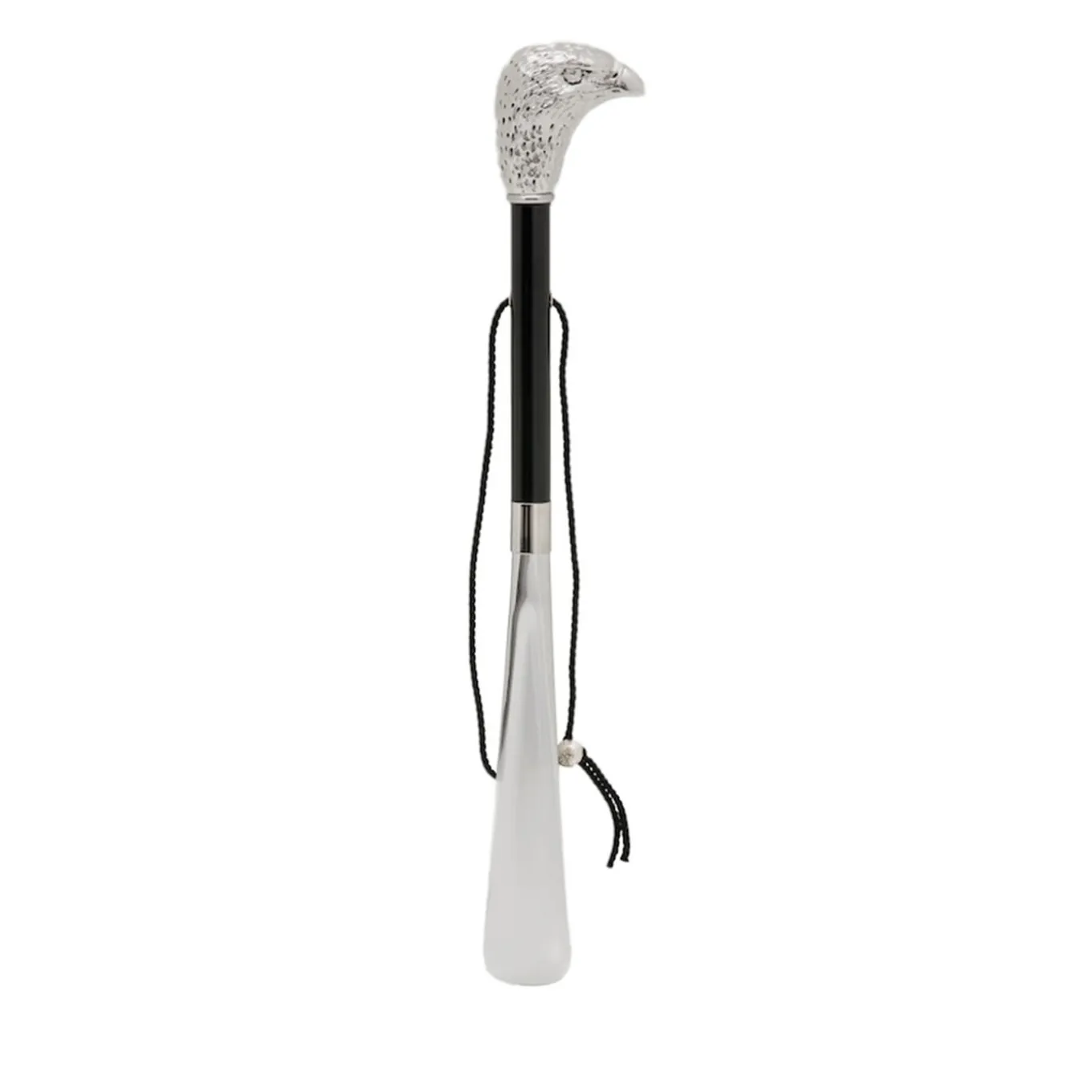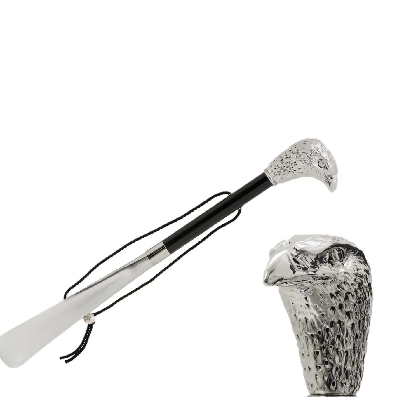 Solidamente realizzata in resina argentata, la testa di un’aquila adorna questo calzascarpe Silver Eagle, che funge da manico di questo accessorio estremamente elegante. Misura 50 cm, ha un fusto in legno, un’estremità in ABS ed è interamente realizzato a mano in Italia.