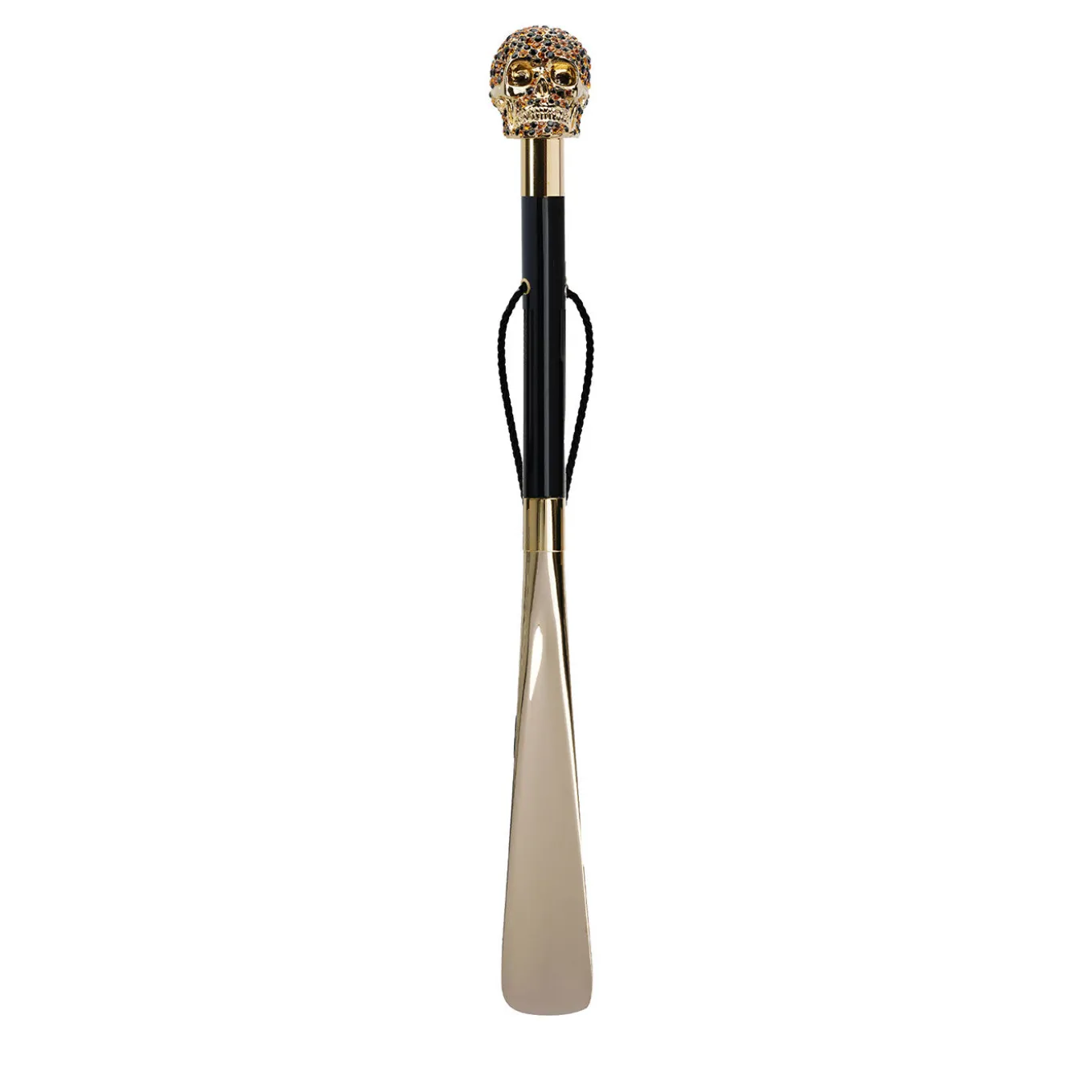 Questo calzascarpe, consegnato insieme a una lussuosa custodia con marchio, presenta componenti luminosi come la paletta in ABS dorata, gli anelli in ottone rifiniti in oro e l’elegante manico a forma di teschio in metallo dorato riccamente tempestato di strass color ambra e neri. La profondità visiva è data dal fusto lucido in faggio laccato nero, dotato di passante in tessuto per essere facilmente appeso.