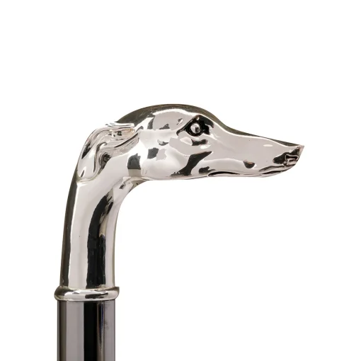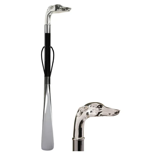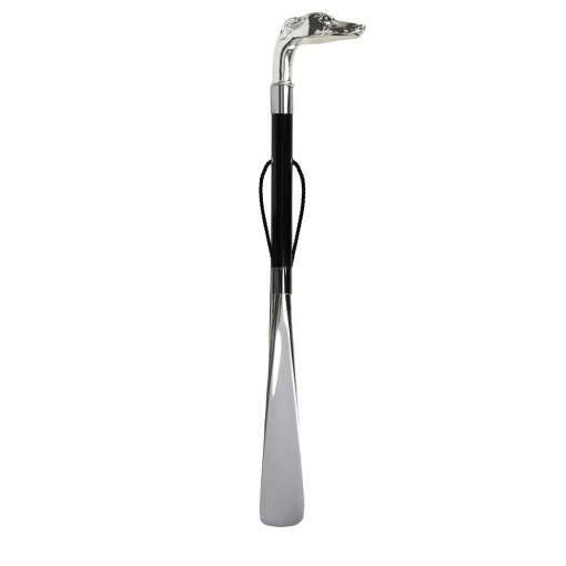 L’eleganza dei levrieri è racchiusa nel manico zoomorfo di questo calzascarpe ornamentale, accessorio di lusso realizzato a mano e dotato di una custodia con marchio. Rivestito d’argento e realizzato in polvere di marmo, il manico è collegato al fusto in faggio laccato nero lucido, che sormonta la paletta argentata in ABS. Gli anelli in ottone argentato mantengono gli elementi in posizione. Un occhiello integrato permette di appenderlo in modo pratico.