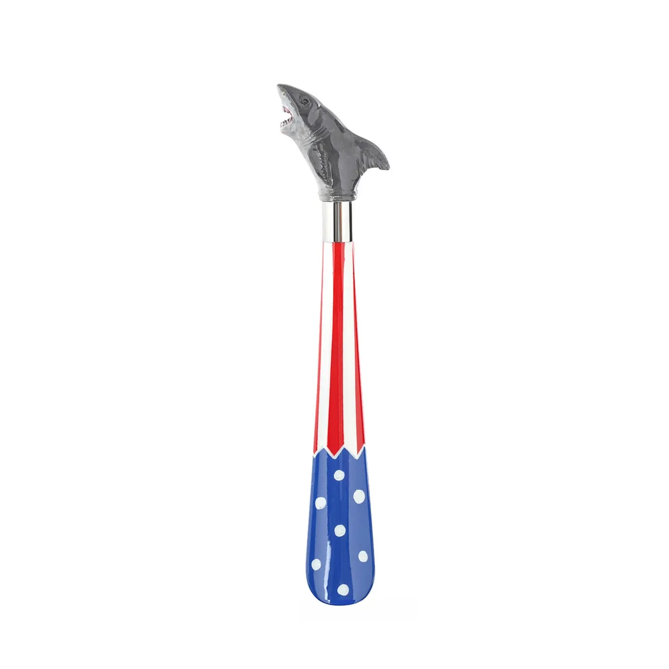 Questo calzascarpe artigianale si distingue per il suo vivace carattere cromatico. Minuziosamente decorato a mano e curato nei dettagli, il manico a forma di testa di squalo in polvere di marmo è collegato alla paletta in ABS di ispirazione rosso-bianco-blu tramite un anello in ottone con finitura argentata. Per le varianti, consultare il catalogo Artemest.