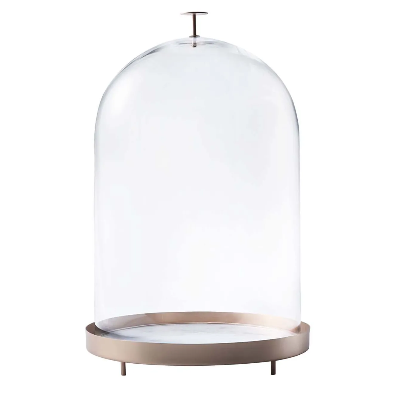 Moderno e sofisticato, questo pezzo è stato disegnato da Elisa Ossino per Paola C. e fa parte di una collezione ispirata alla tranquilla eleganza dei paesaggi lunari. La forma allungata di questa campana di vetro poggia su una raffinata base in marmo di Carrara. I bordi della base e il manico della campana sono in rame, per aggiungere un tocco di colore arrossato al pezzo. Da solo o abbinato alla campana di vetro New Moon, questo oggetto sarà una vetrina versatile per alimenti o oggetti da collezione.