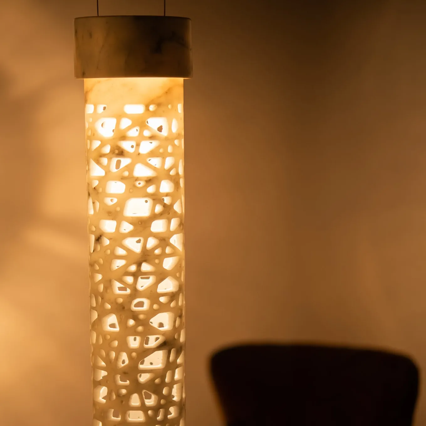 Lampada a sospensione in marmo di Carrara. Finitura opaca per il primo esemplare della collezione numerata Carma, pezzo unico. Il marmo diventa leggero, la lavorazione irregolare crea una texture ammaliante, mai uguale. La luce e la trasparenza esaltano la personalità del materiale, per un’atmosfera suggestiva. Ideale in contesti raffinati, è un tocco prezioso di alta artigianalità negli spazi che lo ospitano.