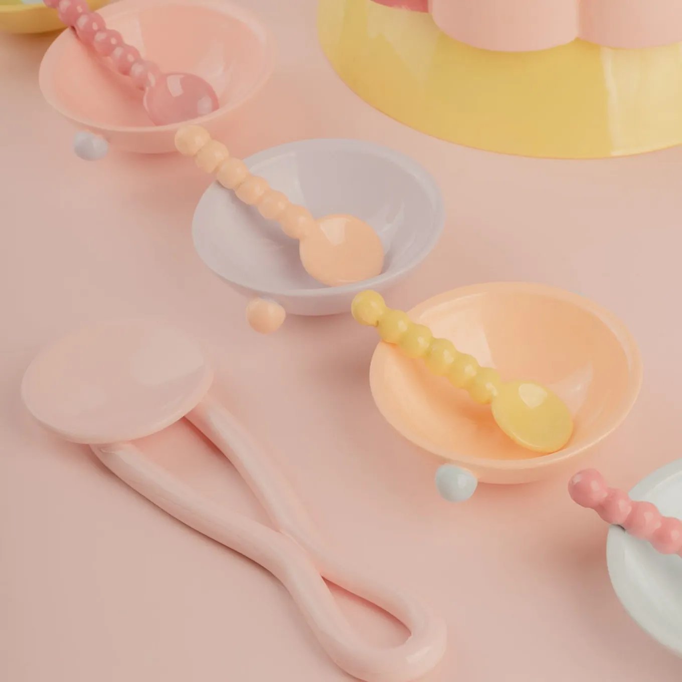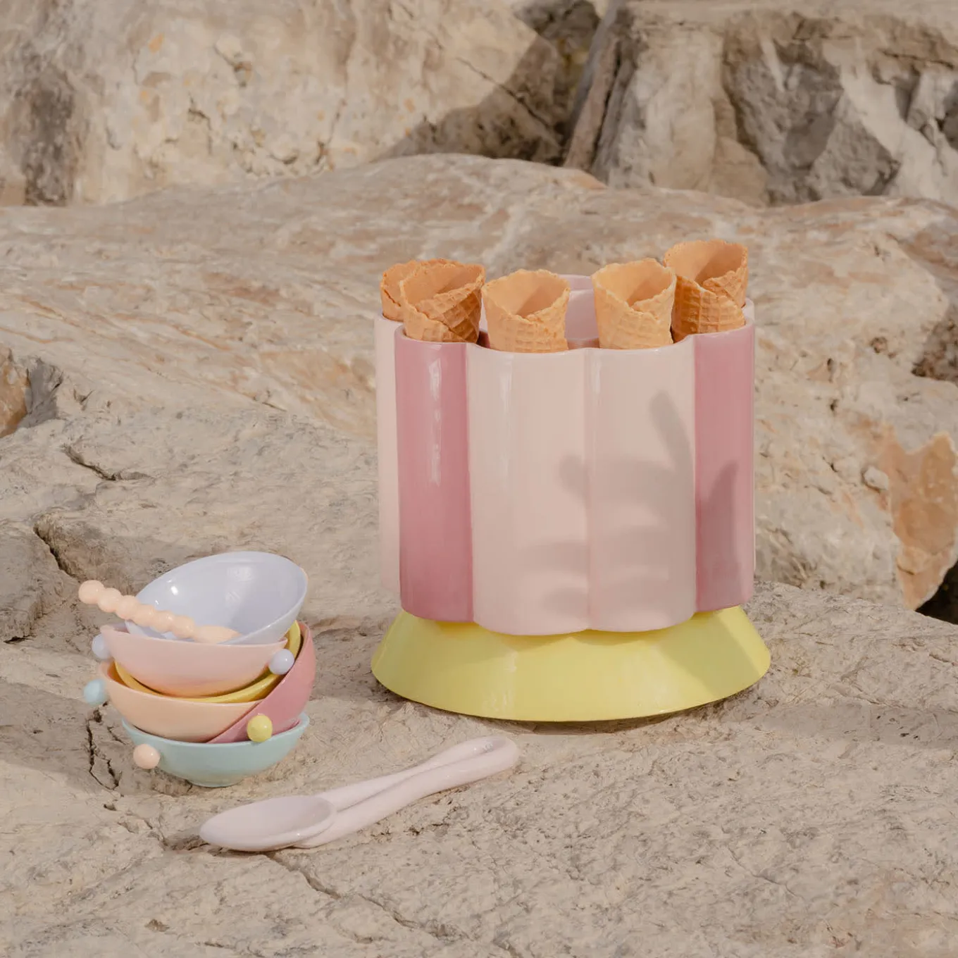 Il set Carosello comprende 6 coppette colorate e 6 cucchiai coordinati, ciascuno con accenti di colore unici. Progettate per contenere 100 g di gelato, le coppette sono dotate di un bordo per facilitare il riempimento. I cucchiaini completano perfettamente le coppette, con dettagli decorativi che ne esaltano il fascino. Disponibile in sei colori vivaci: giallo limone, rosa chiaro, bordeaux, rosa scuro, lilla, rosa pesca e azzurro. Dimensioni delle coppette: 11 cm (diametro) x 4 cm (altezza). Dimensioni del cucchiaio: 9 cm (lunghezza) x 3 cm (diametro del cucchiaio).