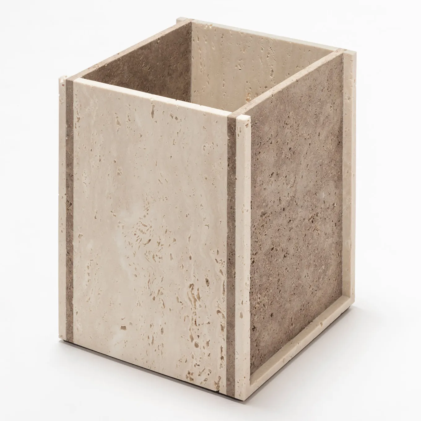 Con i suoi volumi monolitici e puramente geometrici, questa collezione per l’ufficio è caratterizzata da dettagli grafici nati dall’accostamento di due nuance di travertino, che creano un caratteristico contrasto visivo con l’aspetto materico e poroso di tale marmo. Design di Simone Fanciullacci.