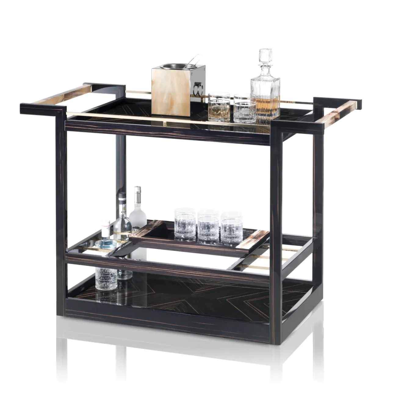 Poggiato su ruote di gomma nascoste, questo opulento carrello da bar vanta un trio di ripiani che forniscono un ampio spazio di archiviazione da cima a fondo. La finitura lucida dell’ebano macassar mette in risalto il motivo geometrico della superficie, aggiungendo una sensazione regale all’intero pezzo. Tre livelli di scaffali aperti consentono di esporre e riporre collezioni vintage di pregio, bicchieri, articoli da bar e strumenti da barista. Il ripiano superiore è dotato di due guide in ottone placcato oro 24k e di due maniglie in corno naturale. Un’aggiunta elegante a qualsiasi spazio per intrattenimenti formali, questo carrello è uno splendido punto focale per qualsiasi stanza.
