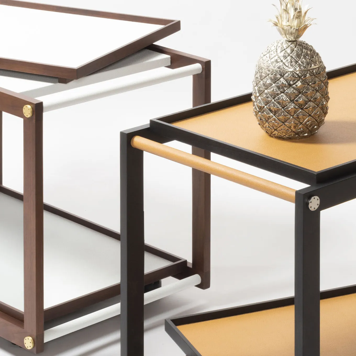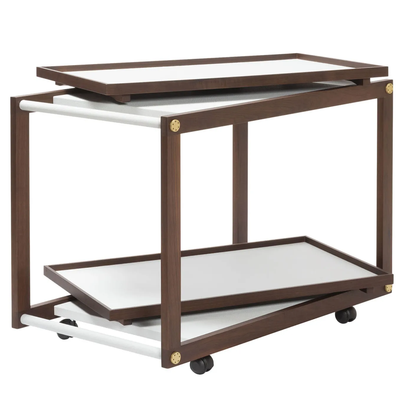 La struttura in legno è disponibile in diverse finiture con inserti in pelle pregiata e metallo. Dotato di due vassoi estraibili e di ruote omnidirezionali. Su richiesta sono disponibili diverse finiture in legno di noce e metallo.