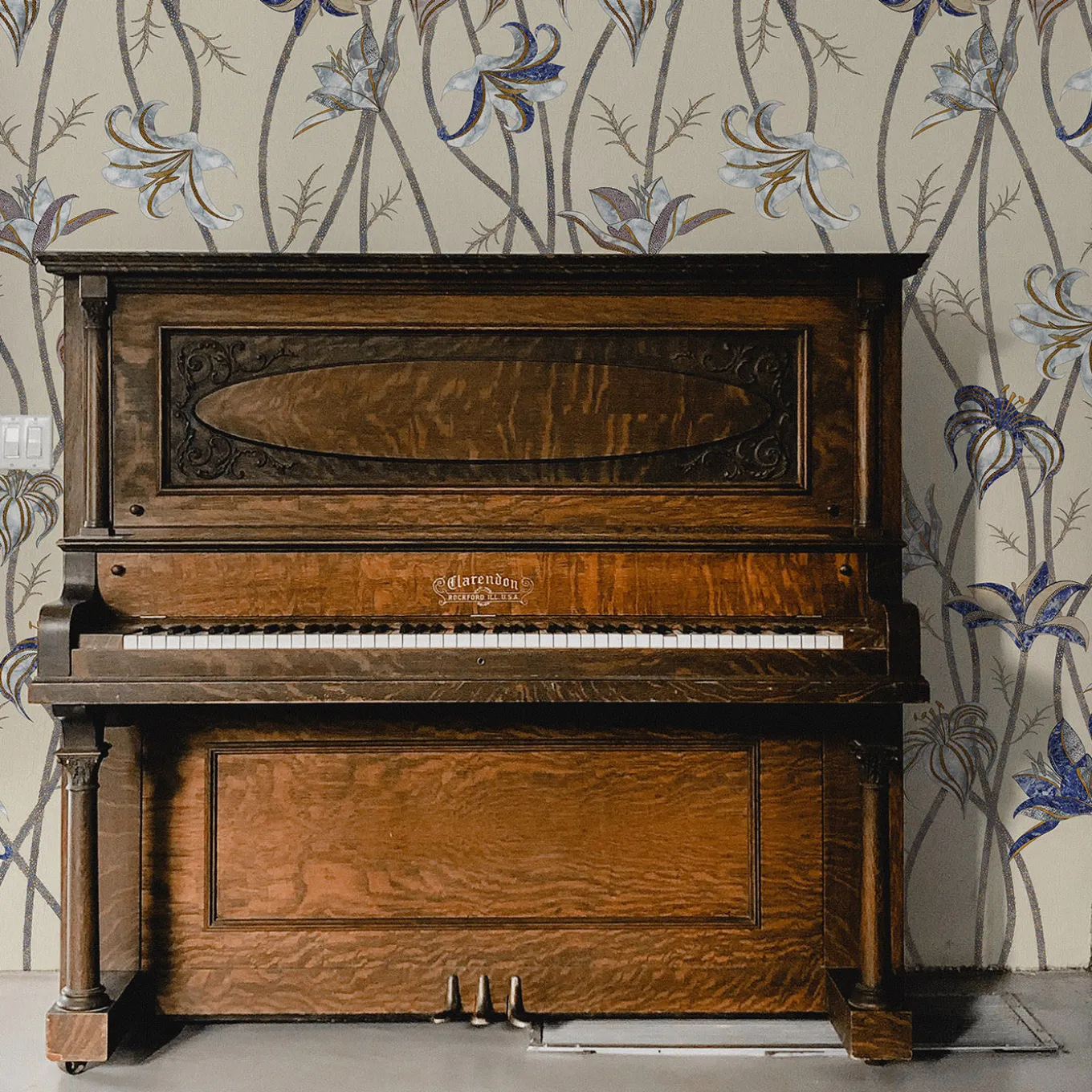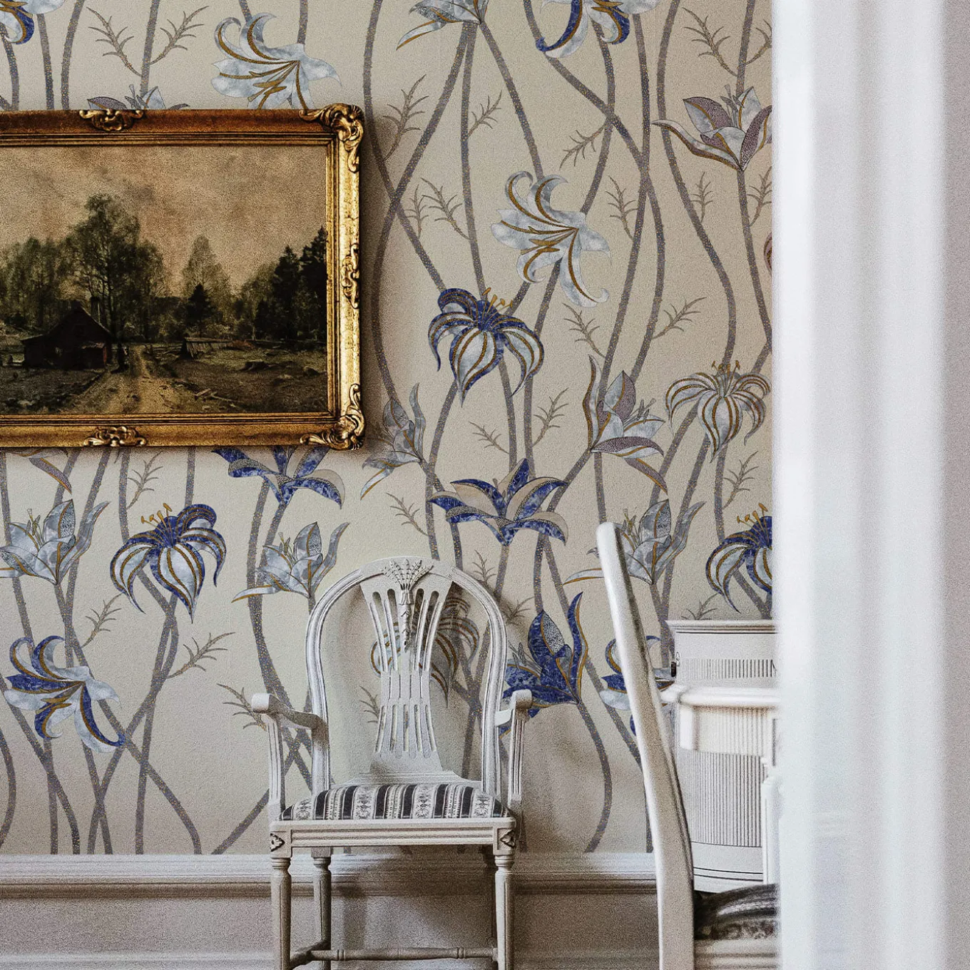 Steli sottili e lunghissimi corrono lungo tutta la parete, per terminare come fiori leggerissimi di Lilium Lancifolium, meglio conosciuto come Giglio di Tigre. Osservando attentamente i disegni di questi fiori, è possibile scorgere colori e texture che fanno parte di un’altra realtà: l’antica tecnica denominata Scagliola, l’Arte della Luna. La carta da parati Fiori è liberamente ispirata a questa antichissima arte, che consisteva nella sapiente lavorazione del gesso. Questo veniva poi utilizzato per sostituire materiali più preziosi.