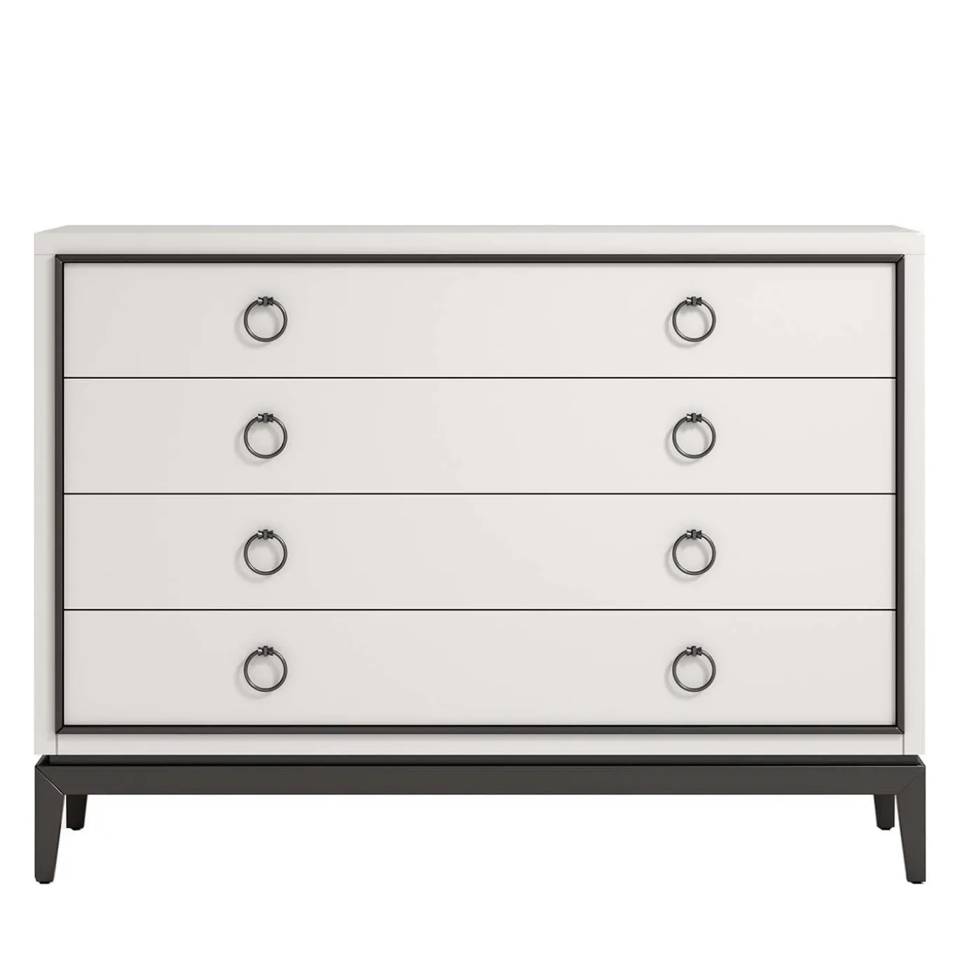 Un’eleganza senza tempo e una sorprendente combinazione di colori sono i tratti distintivi di questo comò a quattro cassetti. La base e i profili in legno massiccio sono laccati in nero, mentre i lati, il top e i pannelli frontali dei cassetti sono laccati in bianco. La maniglia in metallo bronzato è un raffinato tocco finale. I cassetti sono dotati di guide Bluemotion. Sono disponibili altre finiture per il legno, da richiedere al Concierge.