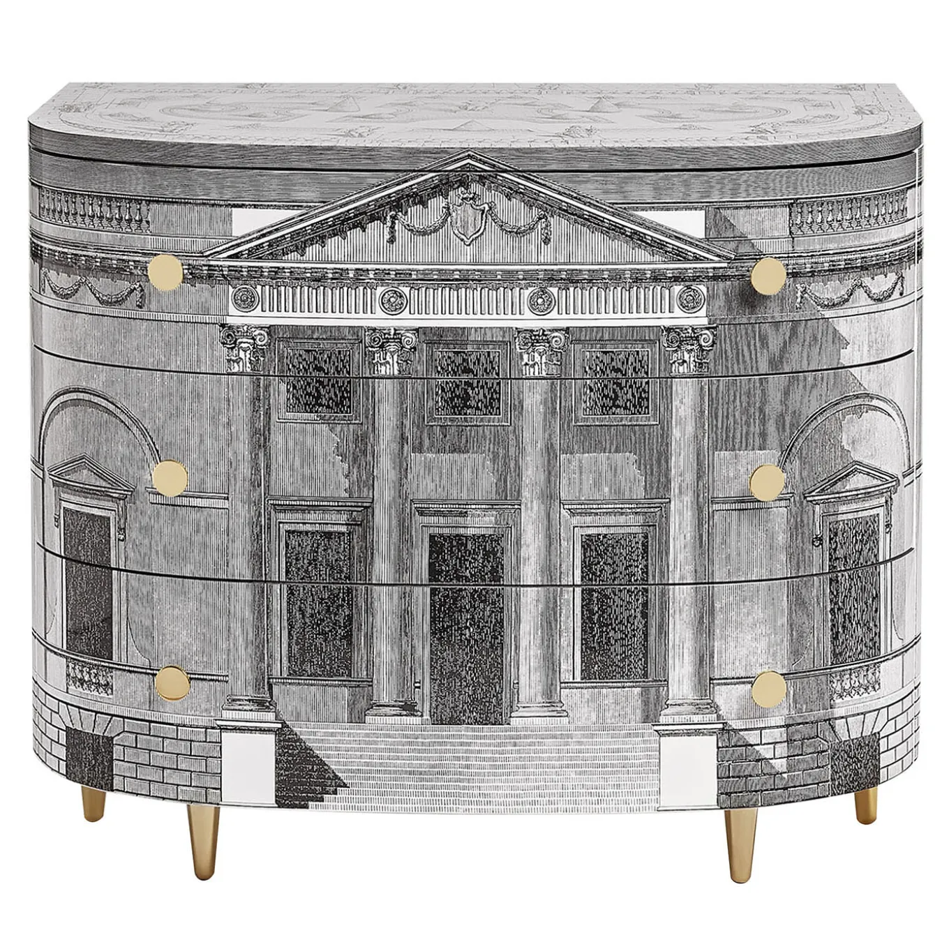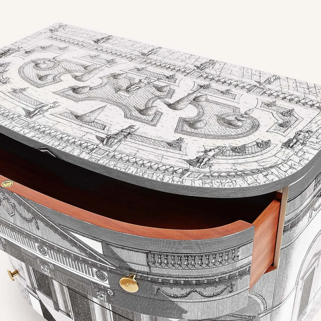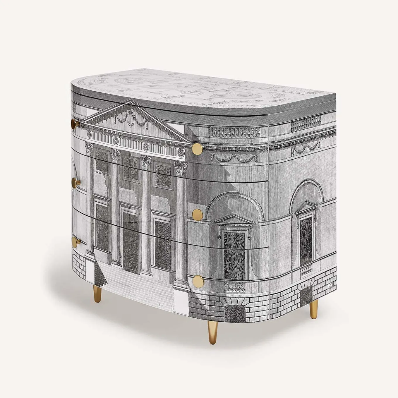 Il contrasto tra il rigore architettonico e le forme arrotondate del mobile è un omaggio al linguaggio neoclassico di Andrea Palladio. La riproduzione di un giardino all’italiana sul ripiano superiore completa questo mobile in legno serigrafato e laccato a mano. Eventuali piccole differenze tra creazioni simili sono il risultato della lavorazione artigianale e attestano l’unicità di ogni prodotto.