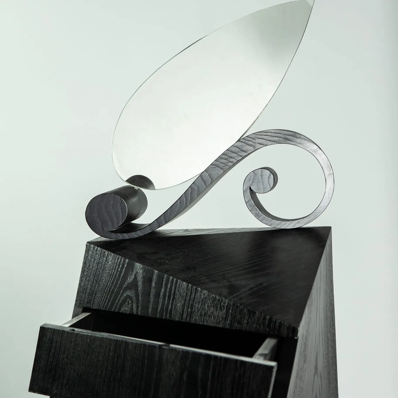 Lussuosa cassettiera nera in edizione limitata dalla forma piramidale irregolare. I cassetti inferiori sono più grandi e si assottigliano gradualmente verso l’alto. Realizzato in rovere laccato nero opaco a poro aperto, questo pezzo unico unisce eleganza e maestria, offrendo una rara aggiunta a qualsiasi collezione di alto livello. Firmato, datato e numerato da 1 a 19, oltre a una prova d’artista.