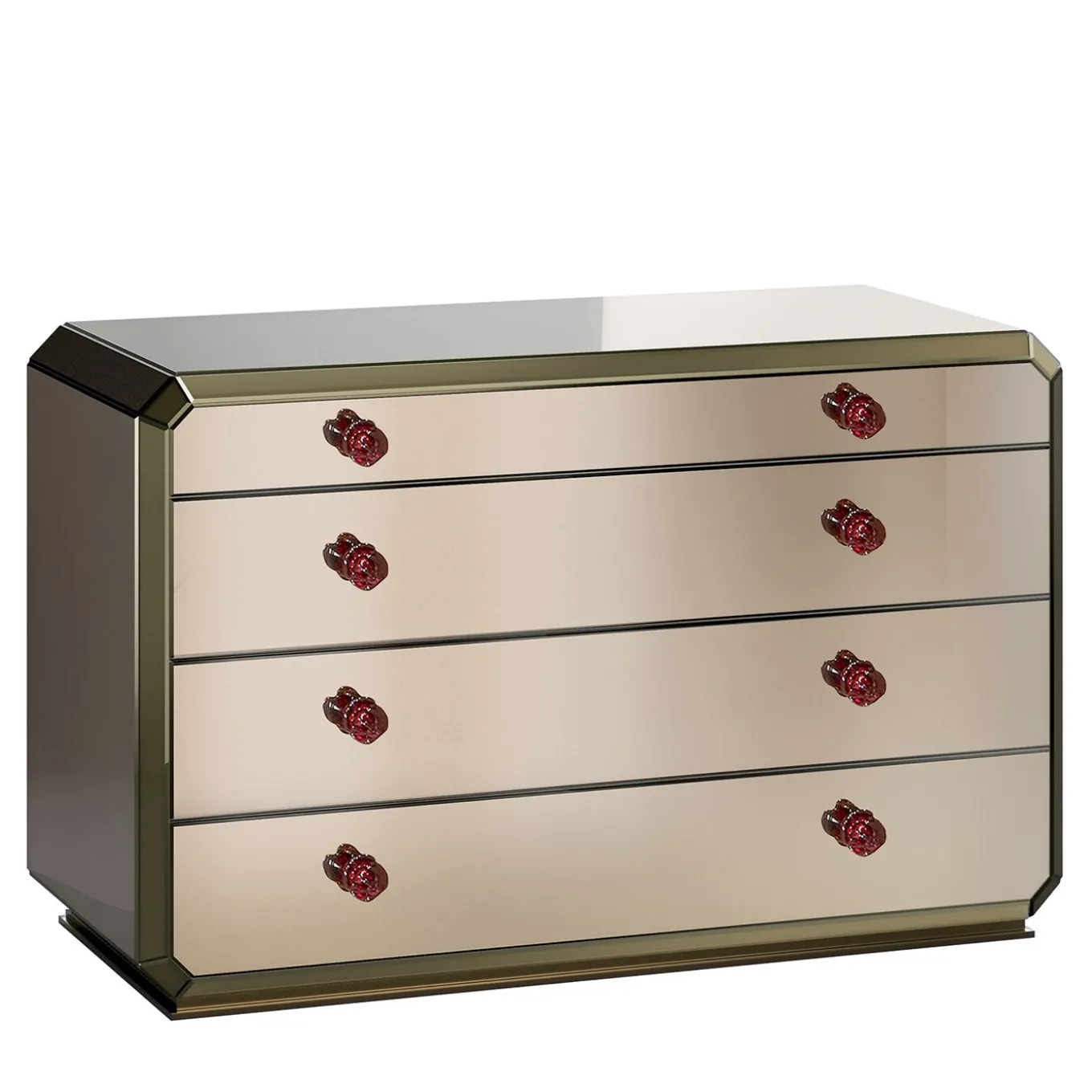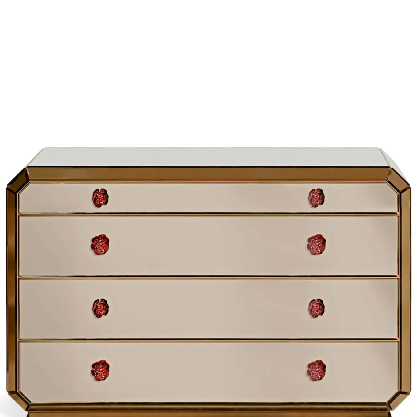 Una forma che ricorda i tagli delle pietre preziose. Le maniglie, in vetro rosso a forma di fiore, sono piccoli gioielli. Una cassettiera dallo stile sofisticato ed elegante.
