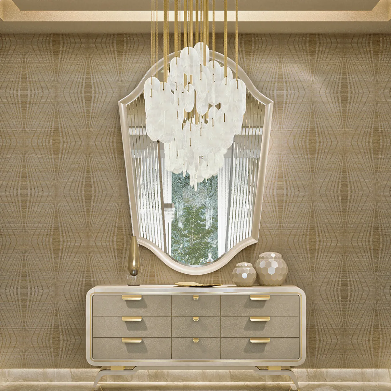 Cassettiera della collezione Hanami. Con struttura in legno, finitura laccata poliestere champagne perlato opaco e dettagli in metallo satinato oro. È composta da nove cassetti con chiusura ammortizzata e cassetti frontali in econabuk con cuciture. Disponibile con rivestimento in econabuk nei cassetti. Disponibile anche con cassetti frontali laccati. Su richiesta sono disponibili altre impiallacciature in legno, colori laccati e metalli.