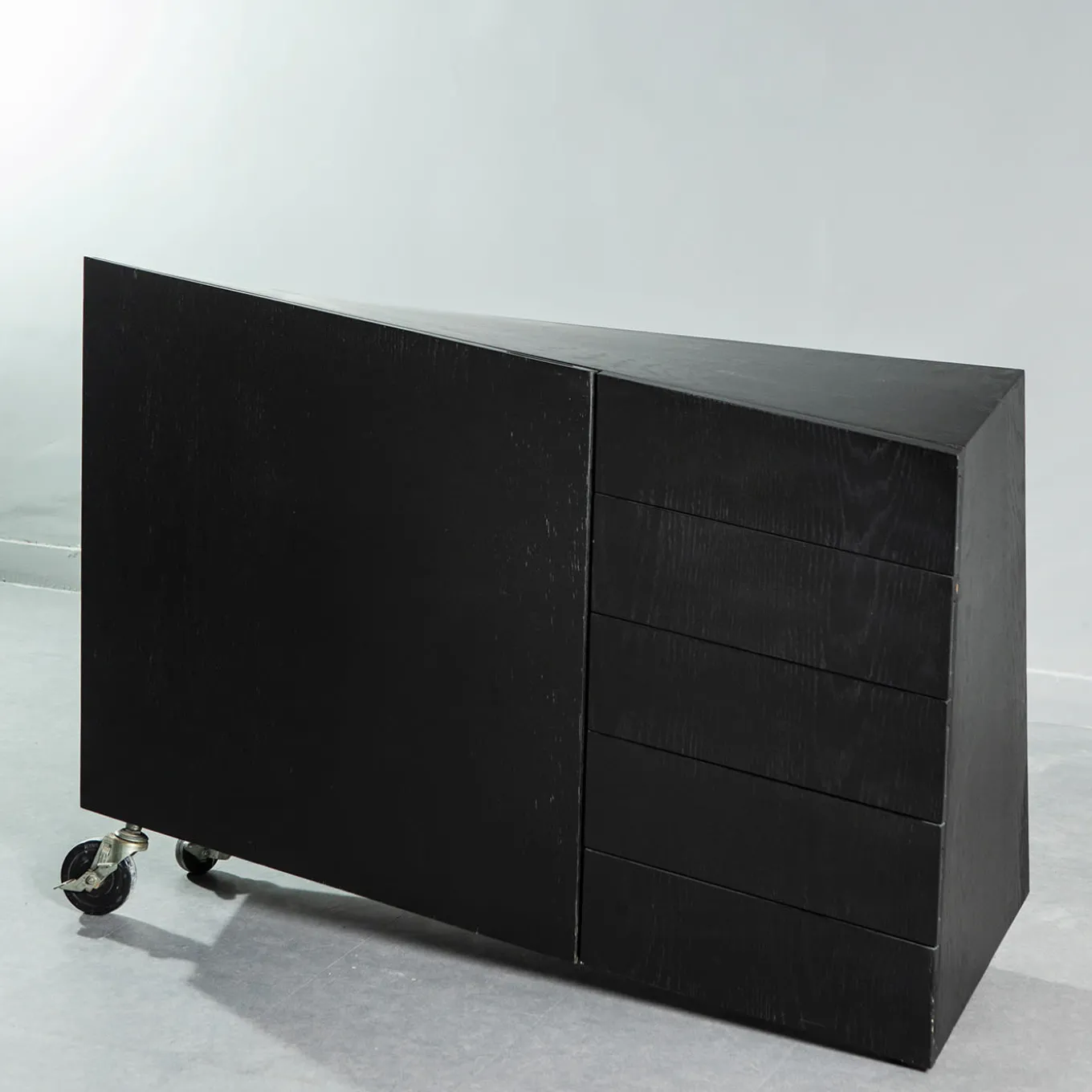 Il pezzo presenta una struttura realizzata in rovere laccato nero opaco a poro aperto, che mette in evidenza le venature naturali del legno. Impreziosito da ruote in stile industriale, unisce l’eleganza moderna a un design funzionale e tagliente. Perfetto per aggiungere carattere e versatilità agli interni contemporanei.