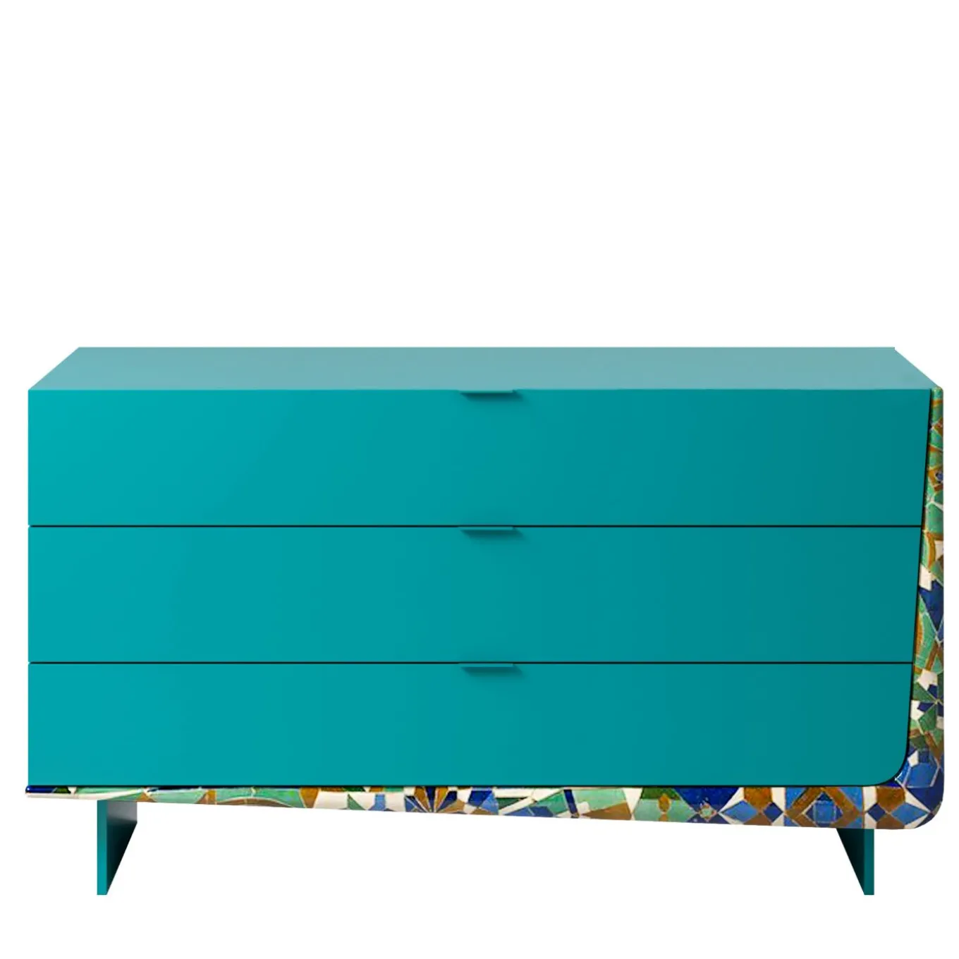 Raffinata allure scultorea e raffinatezza senza tempo definiscono questo raffinato comò, un accento unico per l’arredamento della camera da letto, ideale da abbinare ad altri pezzi della serie Boomerang. Realizzato in compensato rivestito in MDF laccato in una splendida tonalità blu petrolio, presenta tre cassetti completati da maniglie in acciaio laccato e guide Blue Motion con chiusura ammortizzata. Arricchito da una decorazione a motivi senza tempo sul profilo elegante a forma di boomerang, poggia su piedini in acciaio laccato blu petrolio.